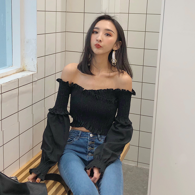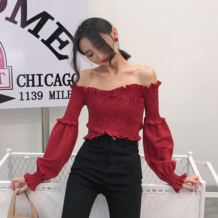 / 春裝新款女裝韓版露臍裝上衣落肩花邊交叉一字領露肩長袖短款襯衫