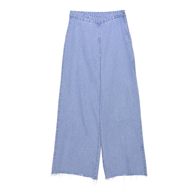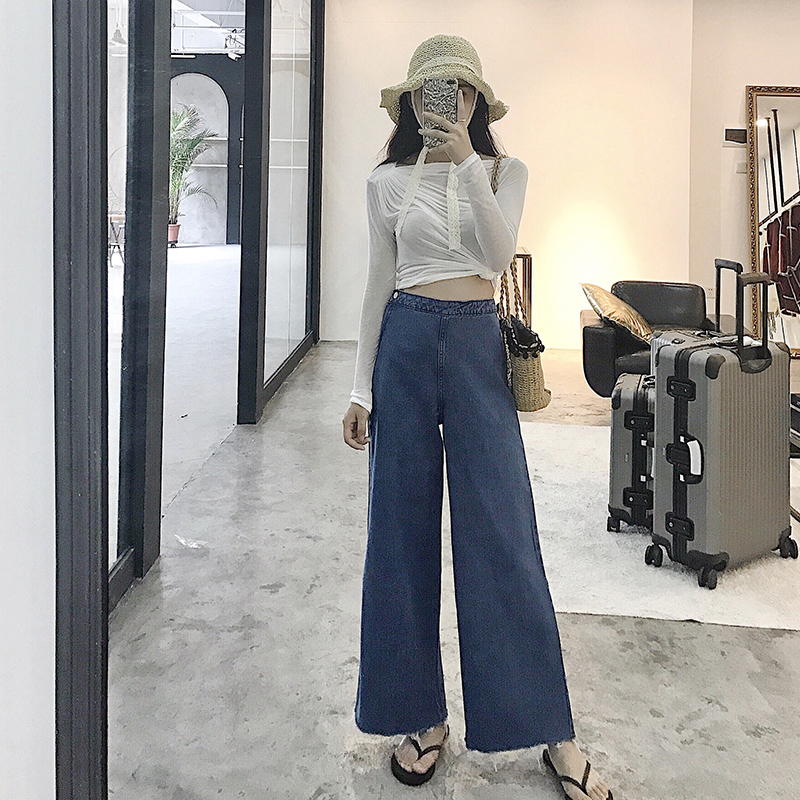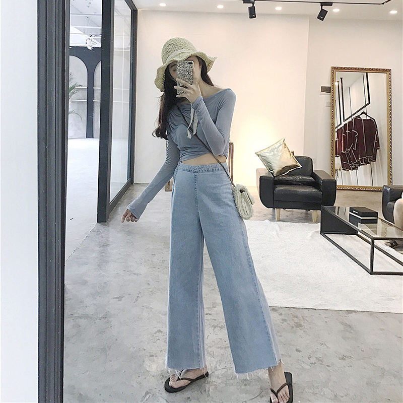 港味復古韓國chic風復古顯瘦淺色撕邊牛仔褲高腰百搭休閑闊腿褲女
