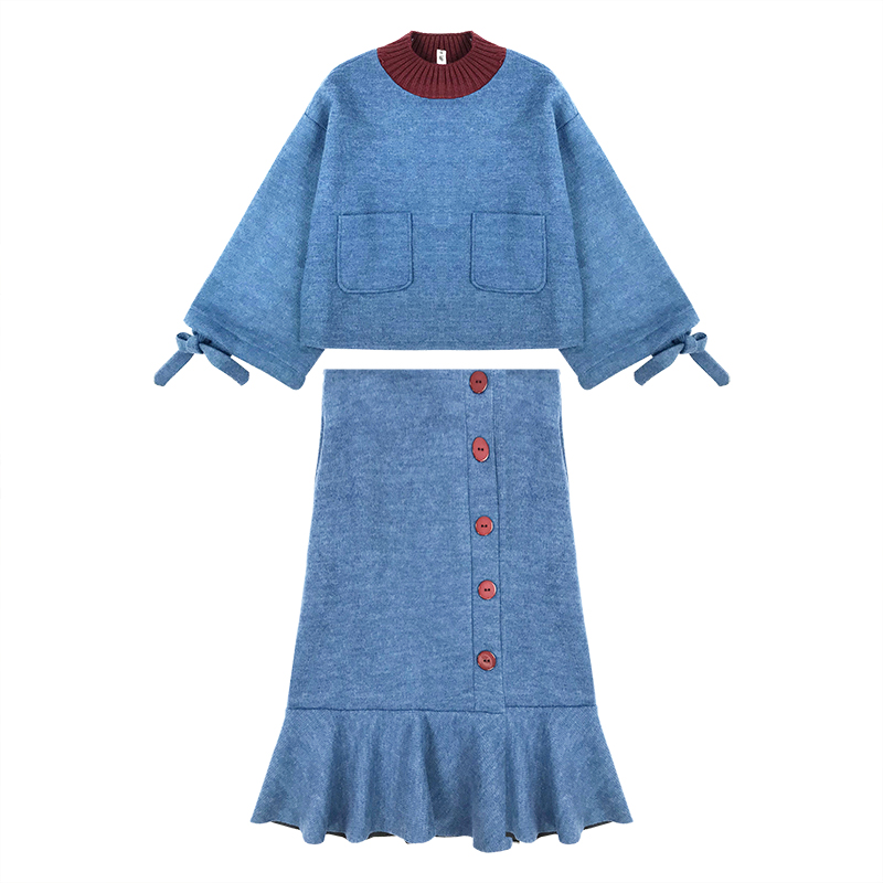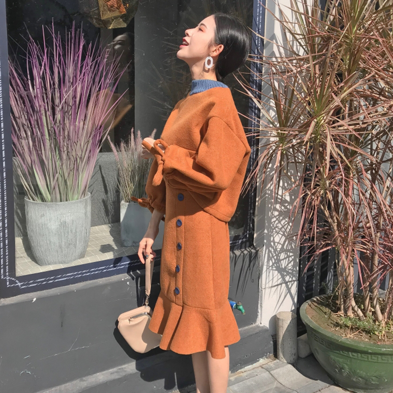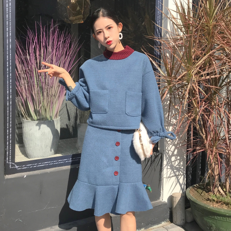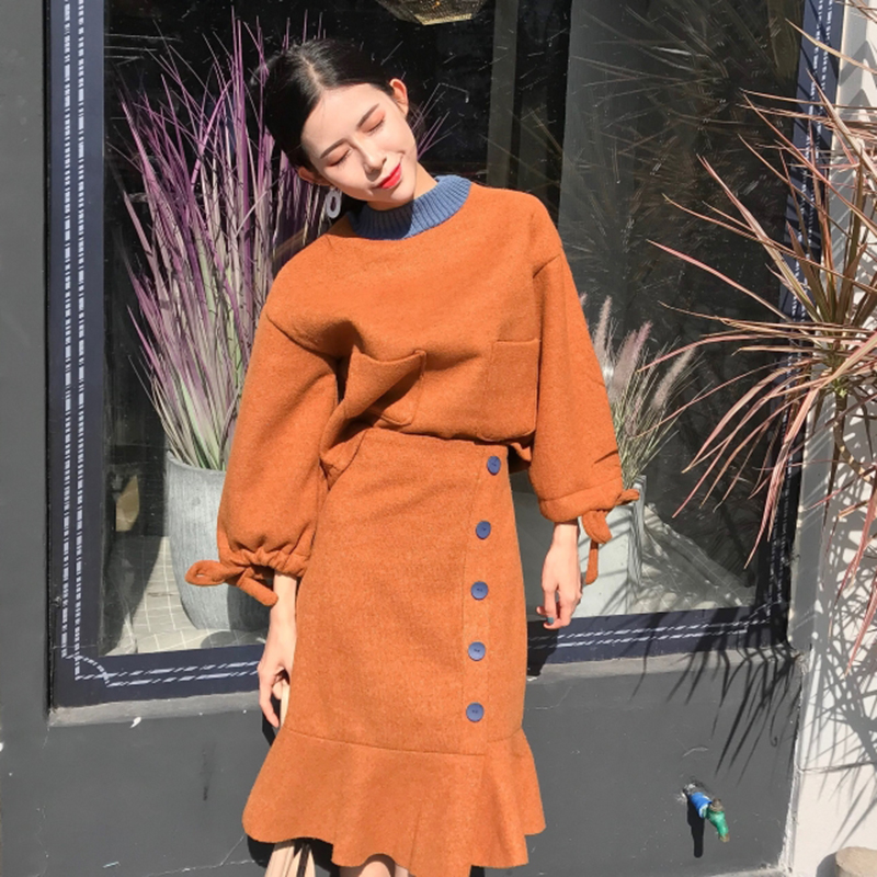 洋氣套裝女秋冬2018新款撞色寬松帶袖衛衣高腰單排扣魚尾半身裙子