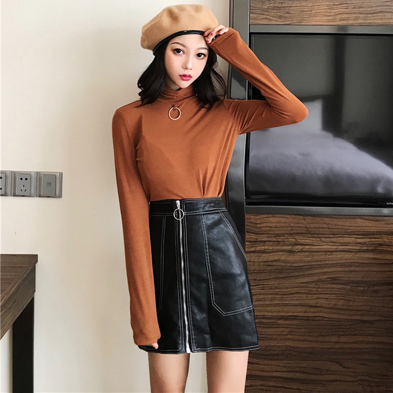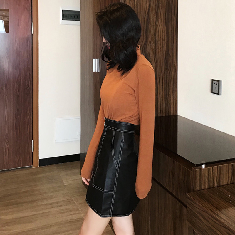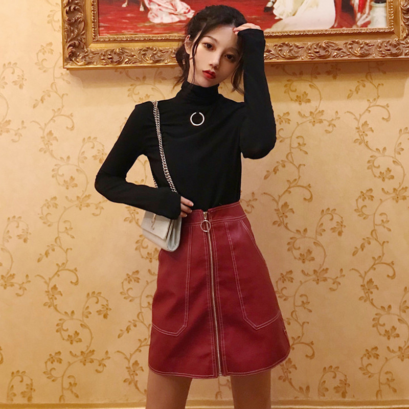 / 御姐套裝女秋冬新款高領修身黑色長袖打底衫T恤顯瘦PU皮半身裙子