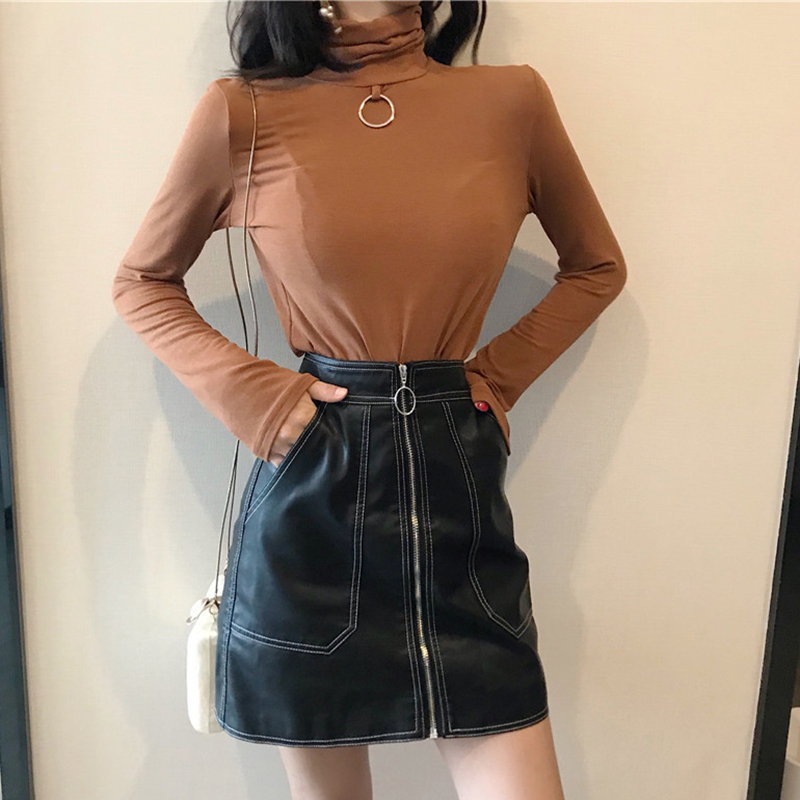 御姐套裝女秋冬新款高領修身黑色長袖打底衫T恤顯瘦PU皮半身裙子
