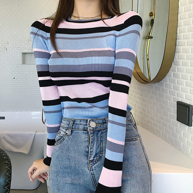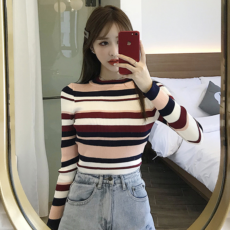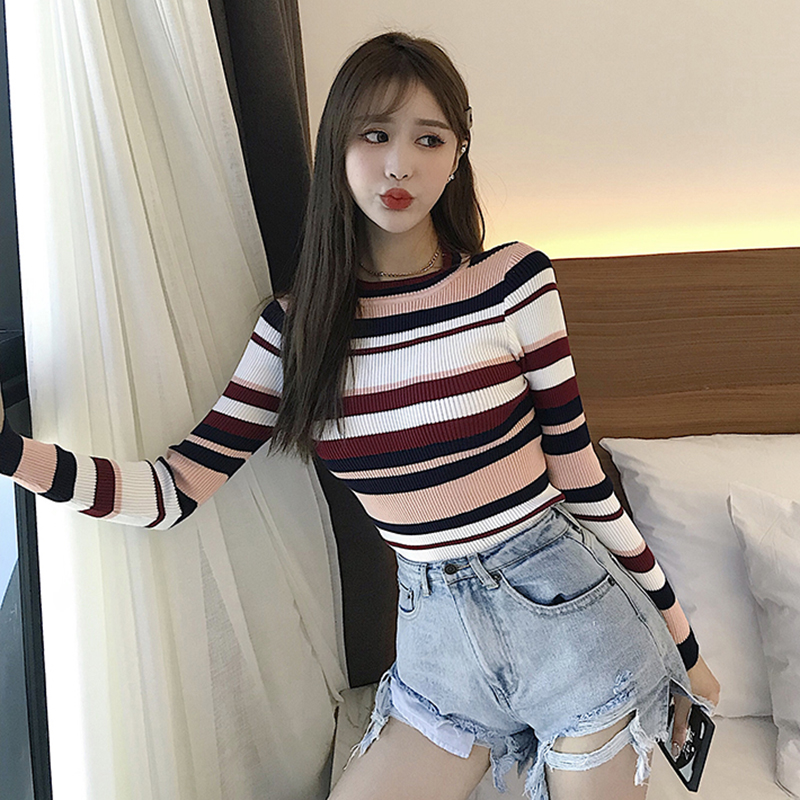 / 韓版chic撞色條紋長袖針織衫女秋冬裝2018新款氣質修身打底薄毛衣