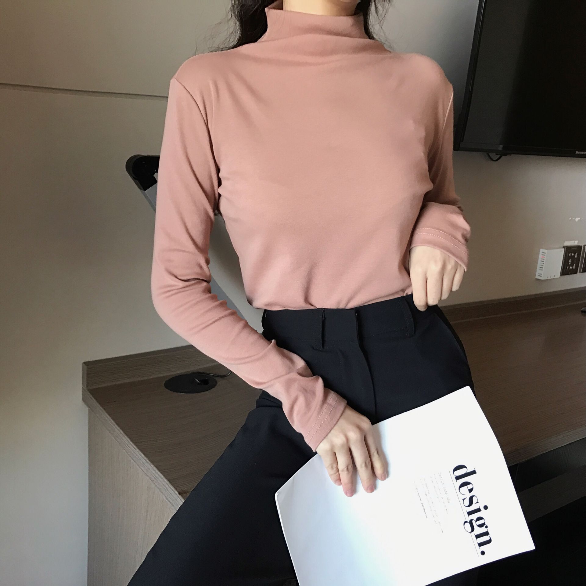 韓版加厚純色百搭修身顯瘦氣質半高領套頭長袖T恤女打底衫女~9色