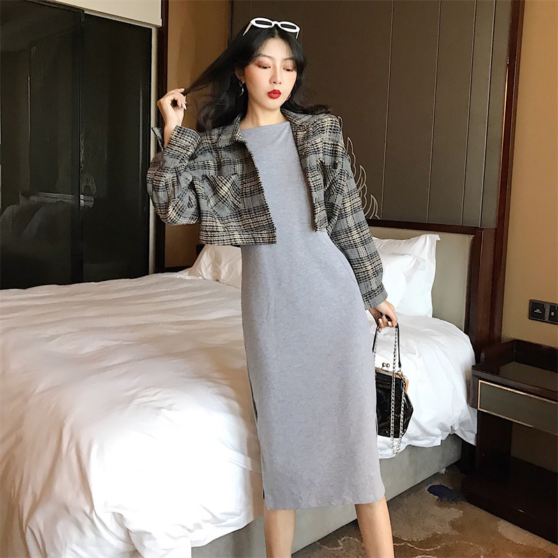 早秋新款復古長袖格子毛呢短外套女修身顯瘦吊帶連衣裙子兩件套裝