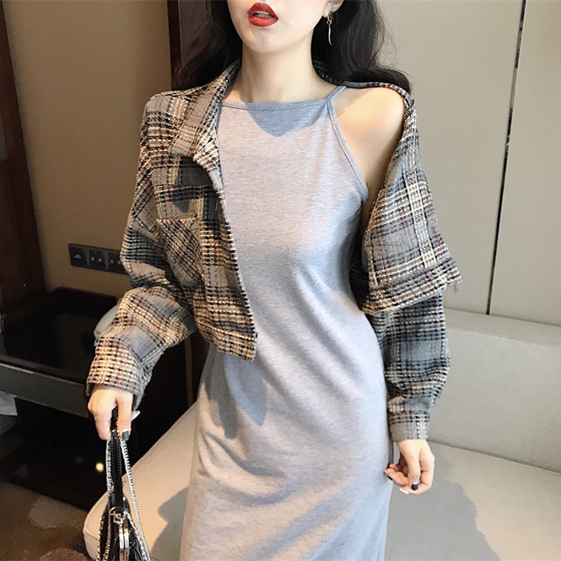 / 早秋新款復古長袖格子毛呢短外套女修身顯瘦吊帶連衣裙子兩件套裝