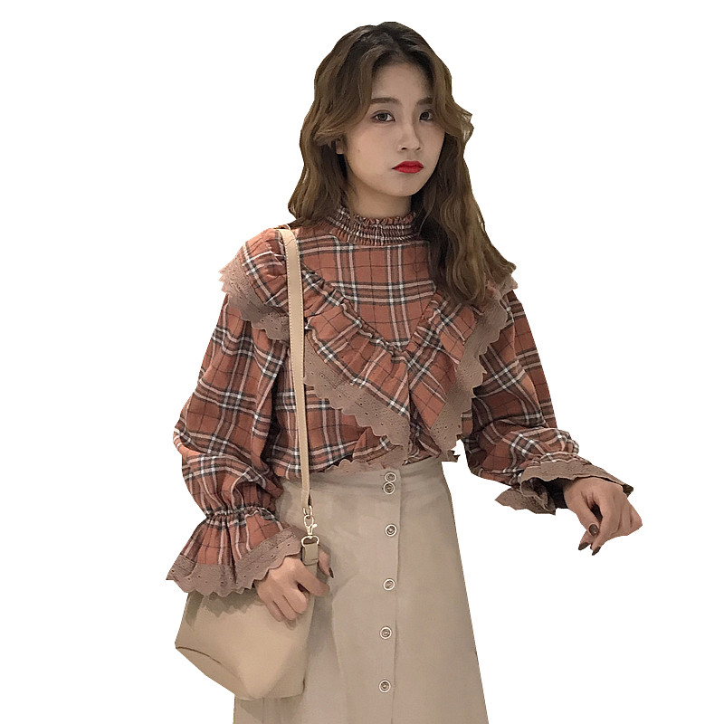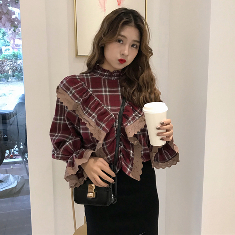 / 秋裝女2018新款復古荷葉邊立領格子襯衫學生休閑燈籠長袖寬松上衣