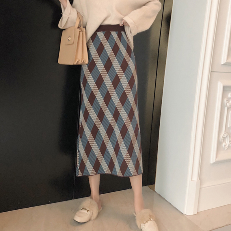 秋冬女裝2018新款中長款針織A字半身裙高腰修身顯瘦格紋包臀裙子