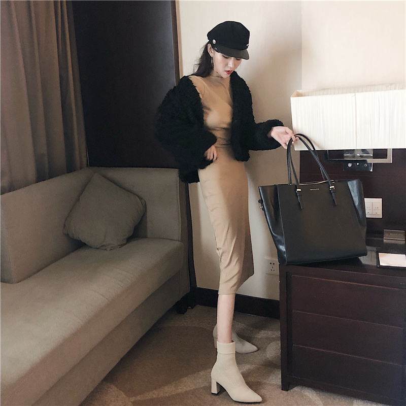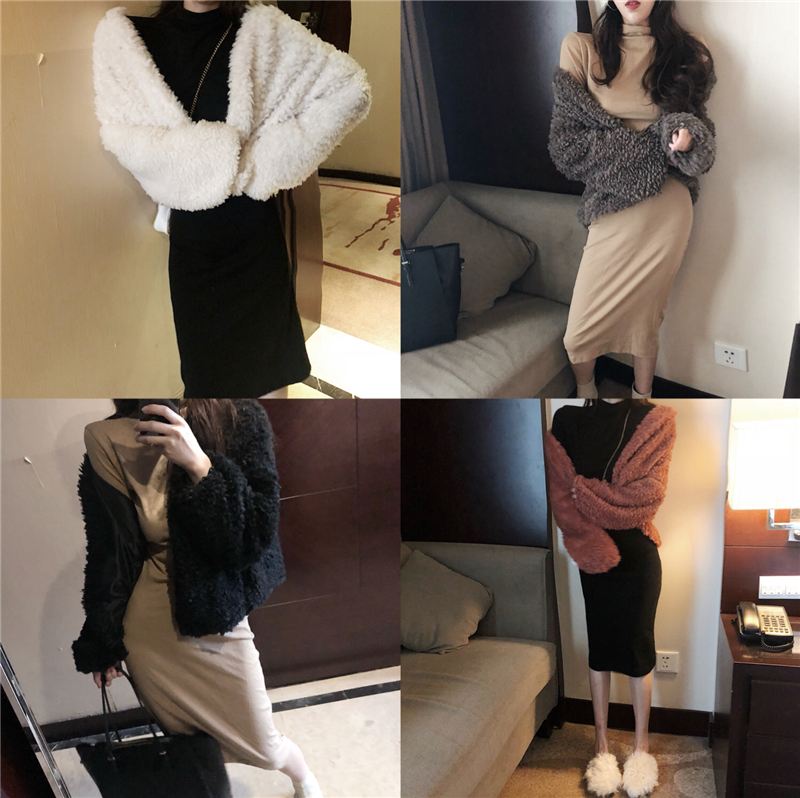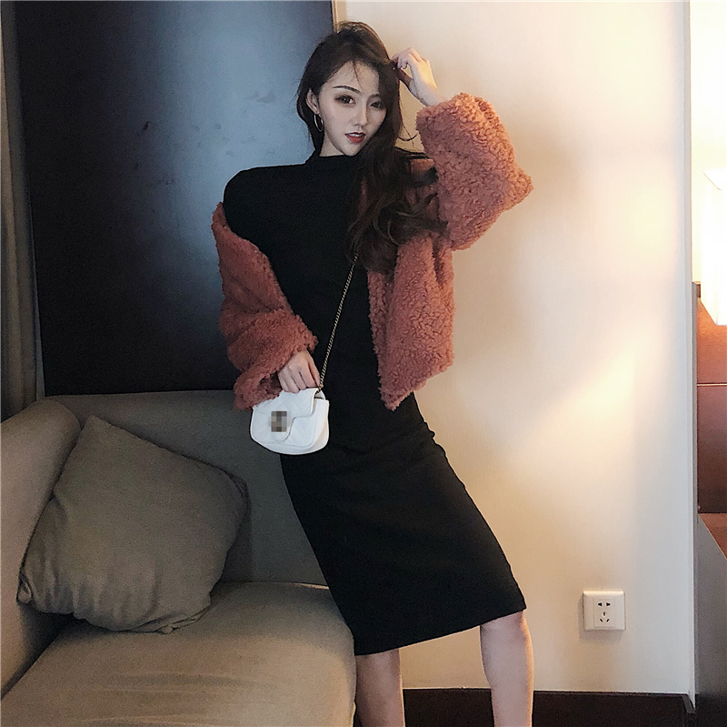 / 韓版秋季套裝寬松短款羊羔毛長袖開衫+中長款半高領打底連衣裙女
