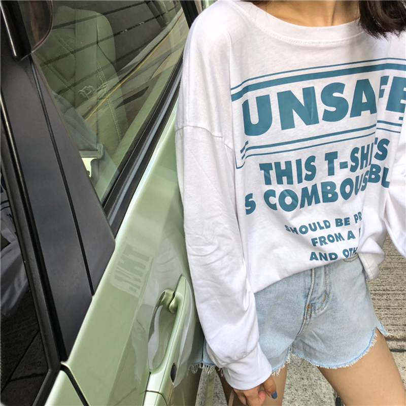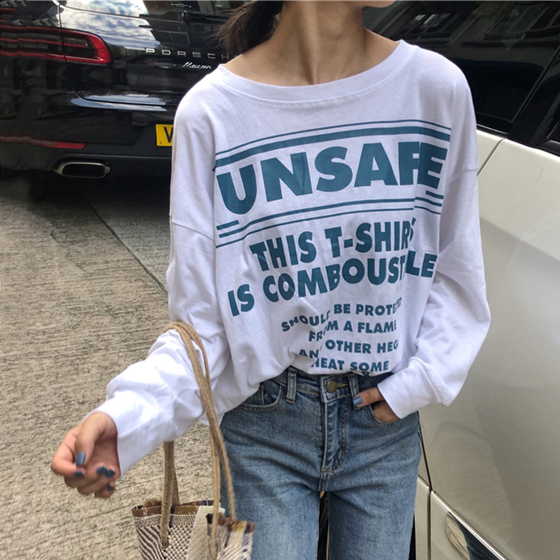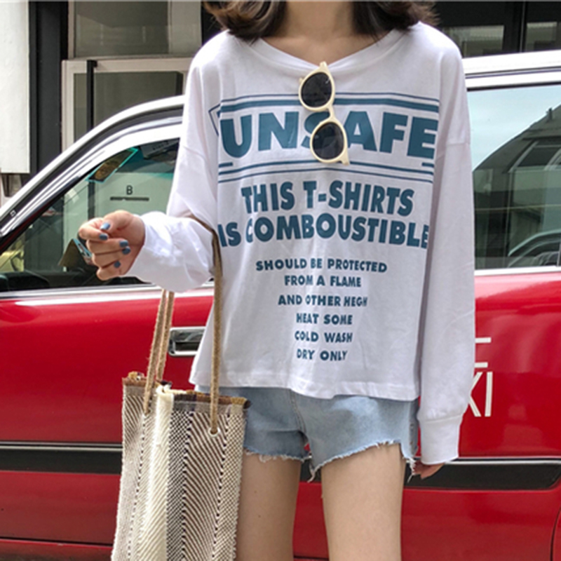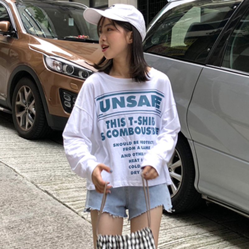 T恤女夏新款韓版女裝套頭圓領字母印花體恤學生薄款長袖寬松上衣