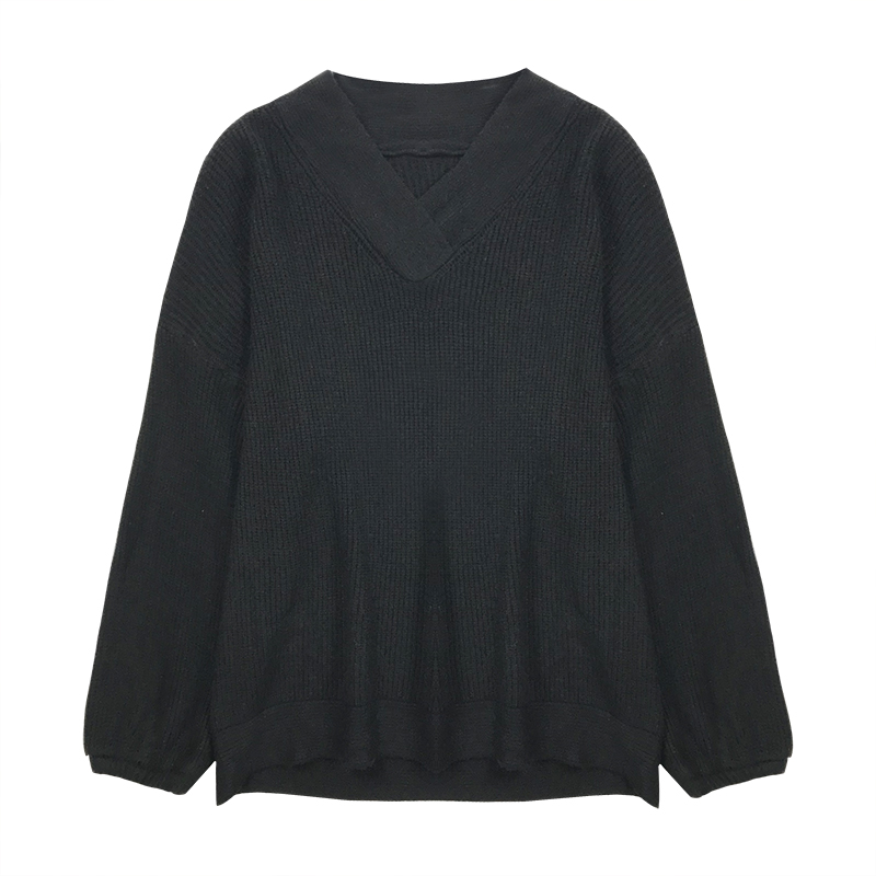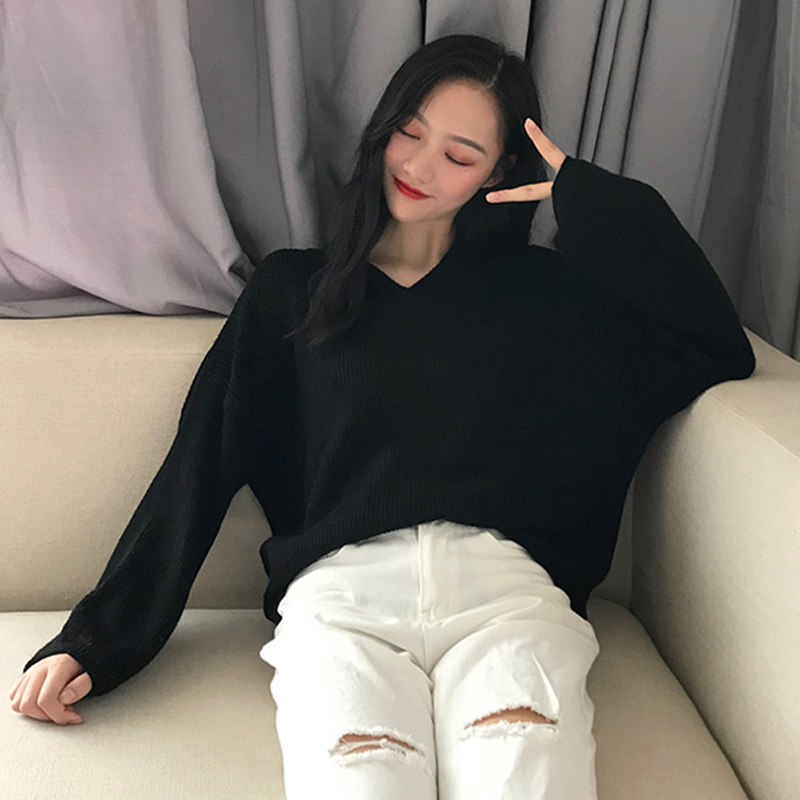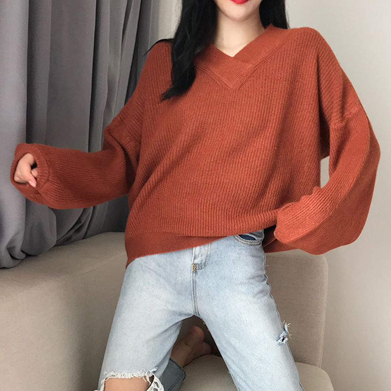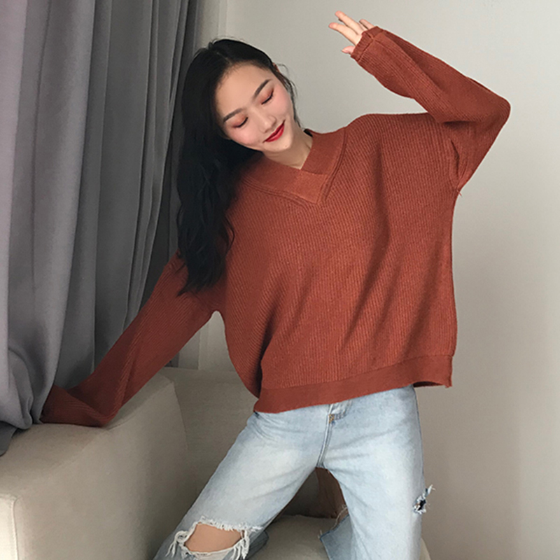 / 女秋裝新款慵懶風純色針織衫毛衣女學生寬松V領套頭長袖打底上衣