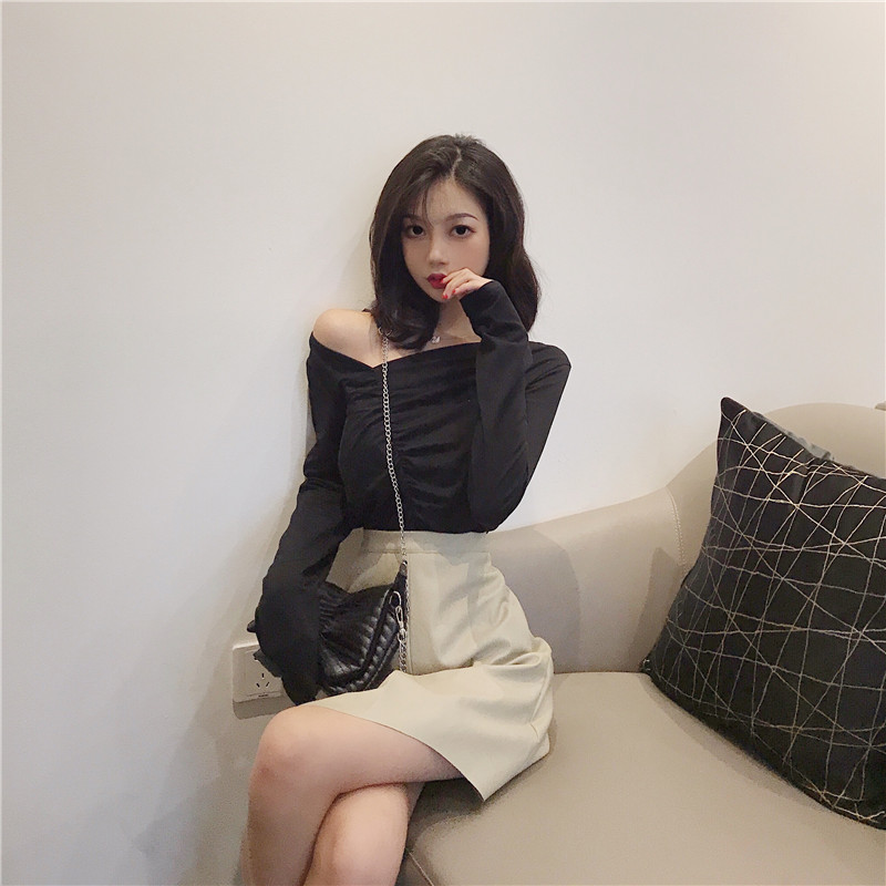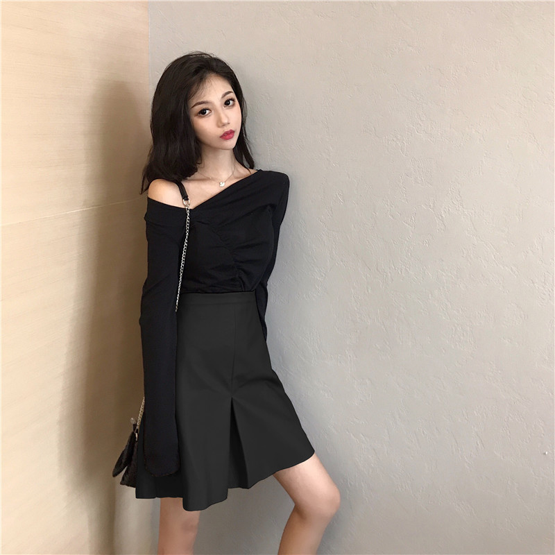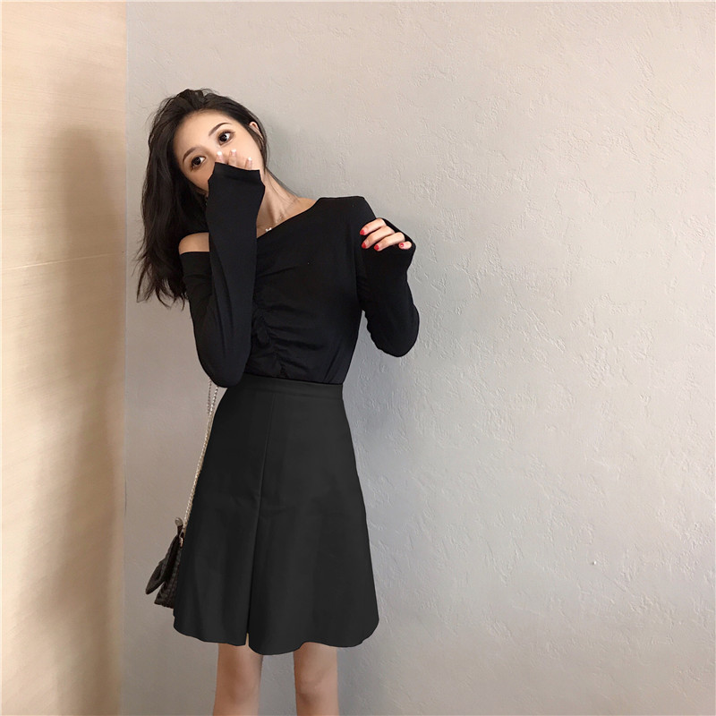 秋季套裝PU皮裙半身裙女高腰a字裙包臀短裙子+小心機露肩T恤上衣