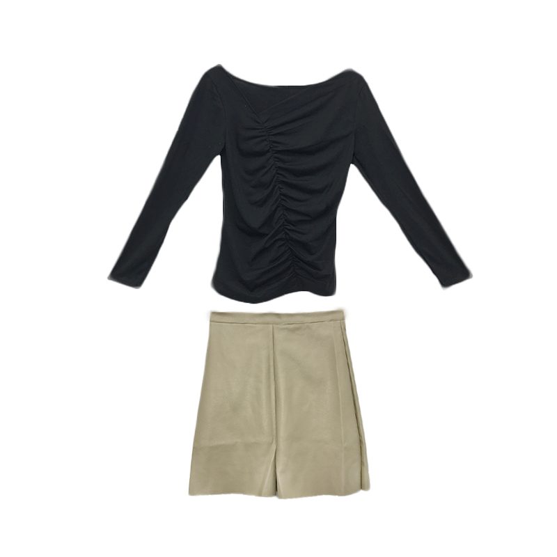 / 秋季套裝PU皮裙半身裙女高腰a字裙包臀短裙子+小心機露肩T恤上衣