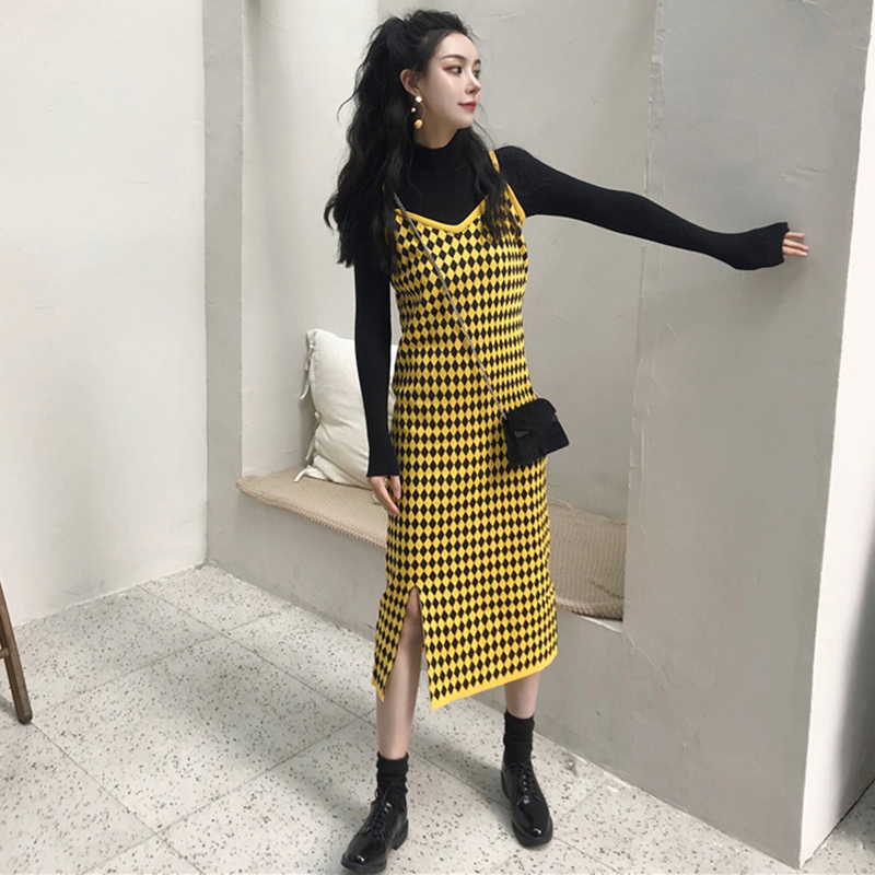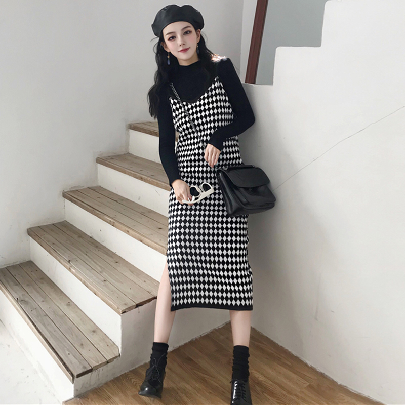 / 御姐針織套裝女秋冬新款修身長袖黑色打底T恤時尚格子吊帶連衣裙