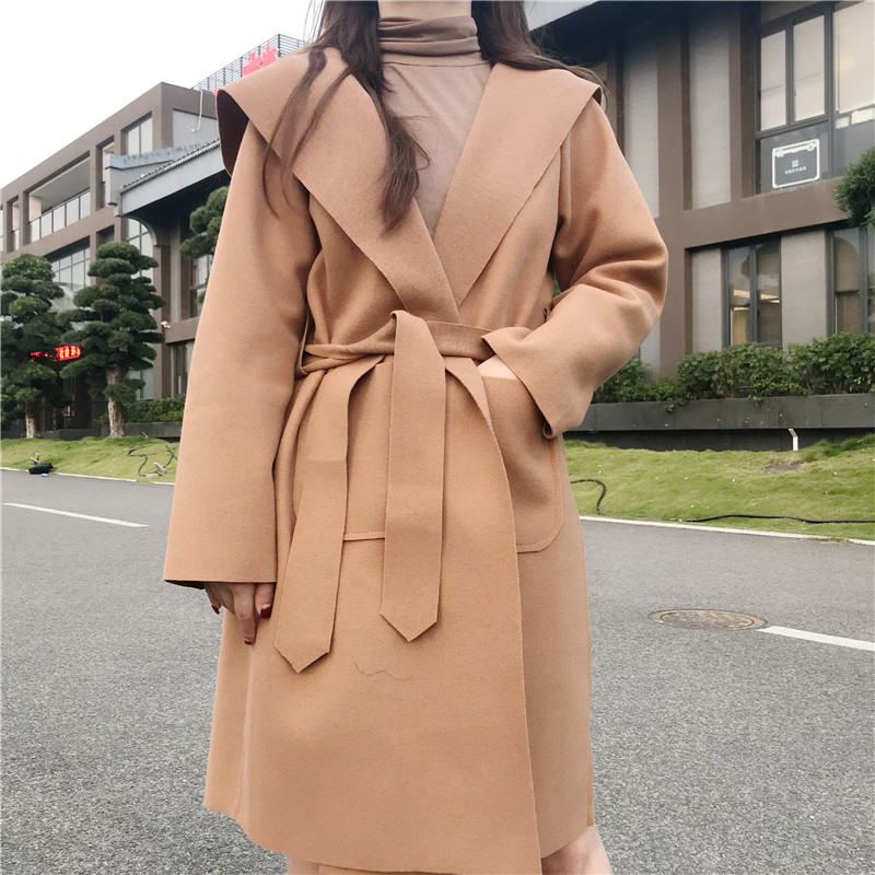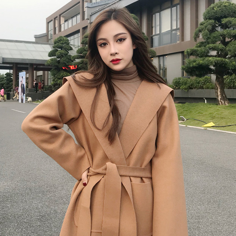 / 中長款2018流行呢子大衣女冬裝新款寬松長袖系帶收腰連帽毛呢外套