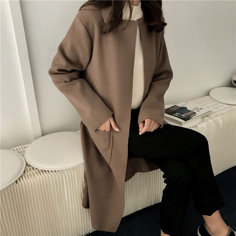 中長款毛呢外套秋裝女2018新款簡約純色呢子風衣系帶休閑開衫上衣