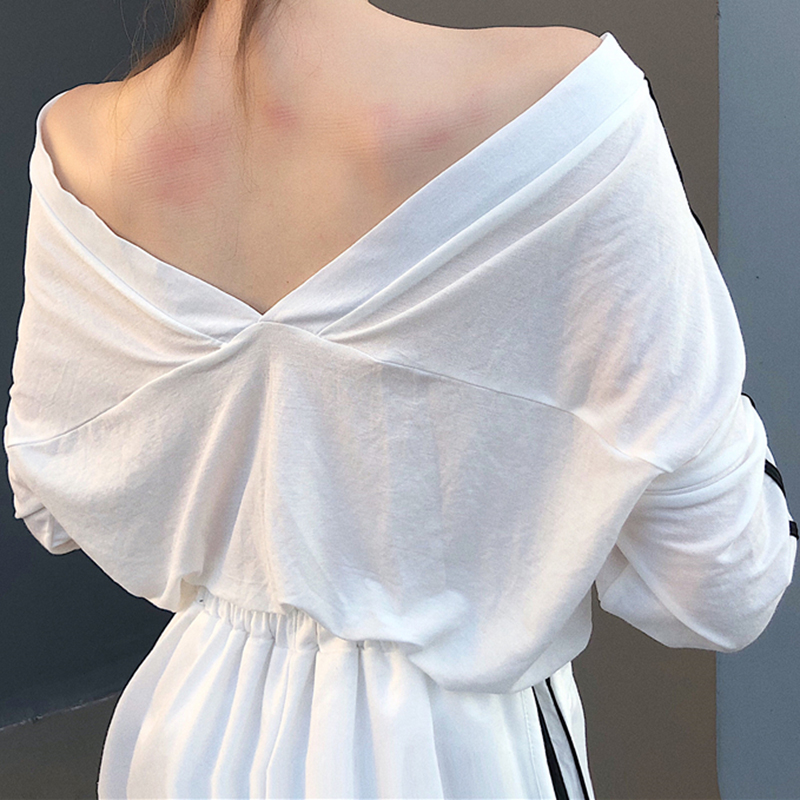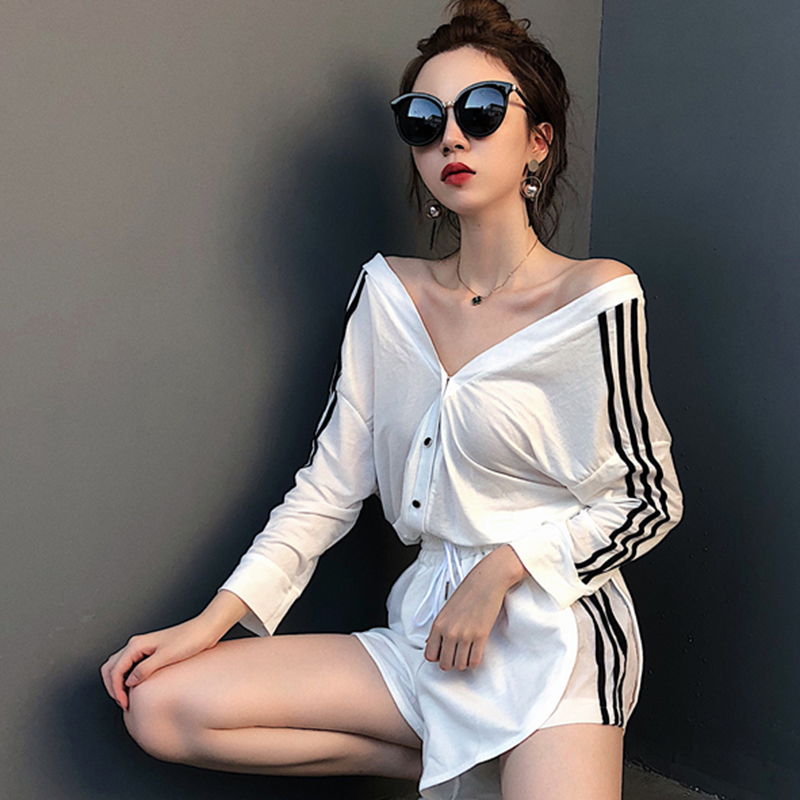 運動套裝女夏新款韓版女裝露背V領長袖T恤+拼色條紋寬松闊腿短褲