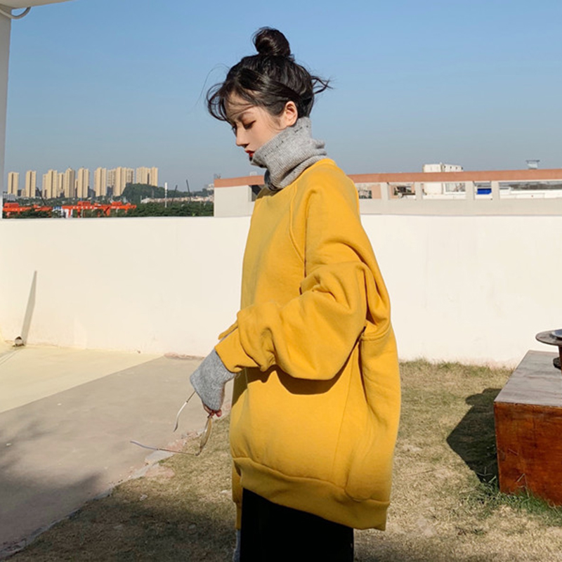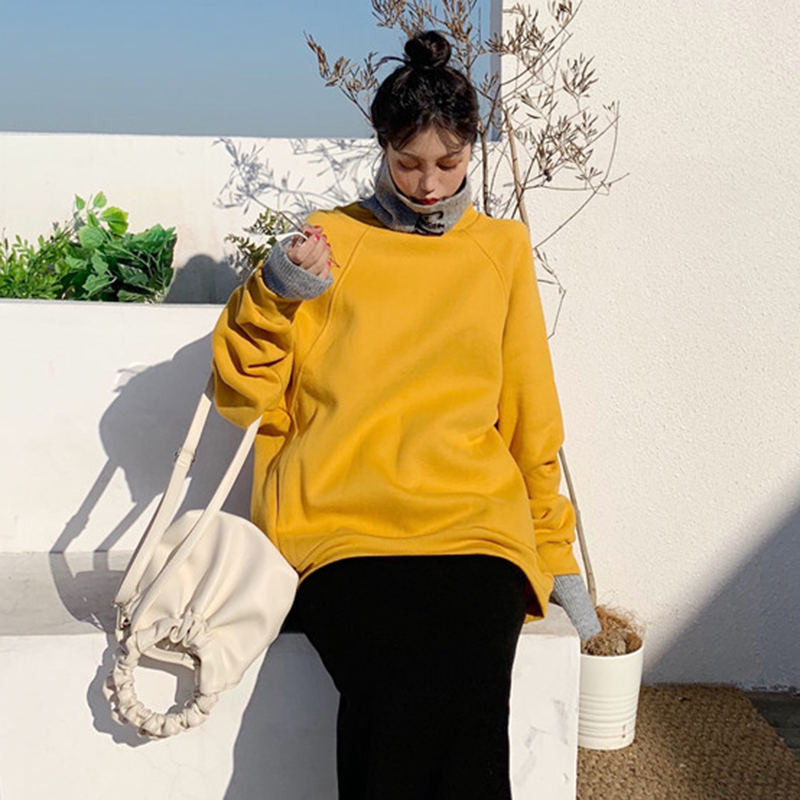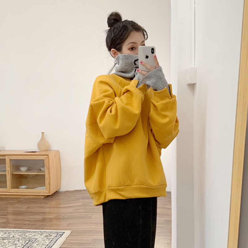 女冬裝2018新款寬松加絨套頭衛衣假兩件字母針織拼接高領撞色外套
