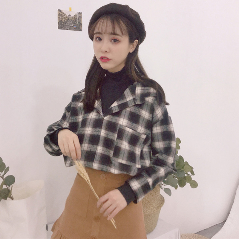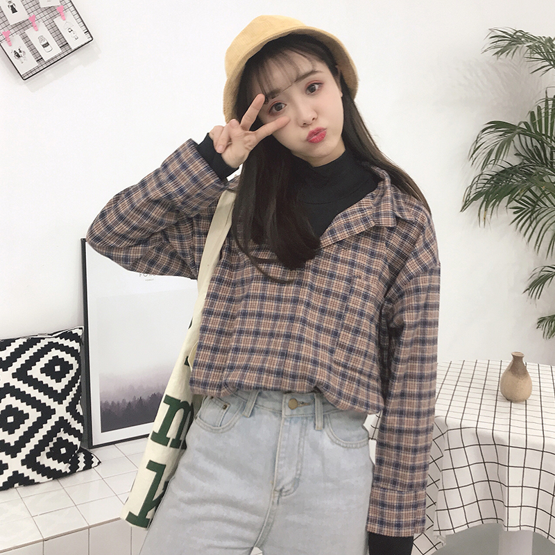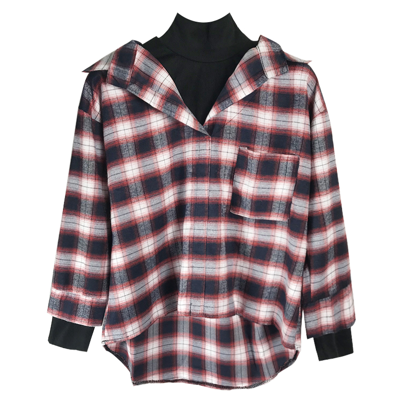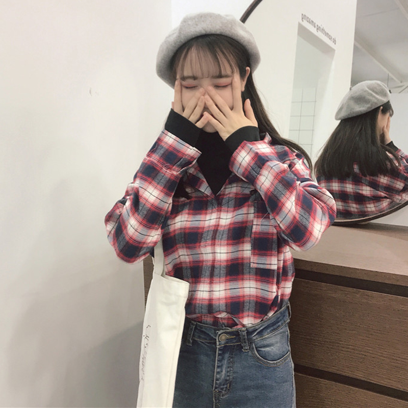 / 港味復古格子襯衫女秋裝新款拼接假兩件襯衣學生寬松百搭長袖上衣