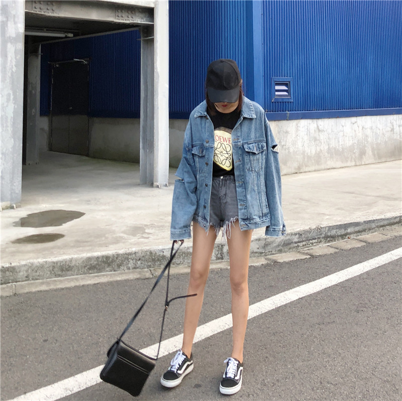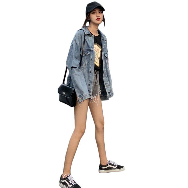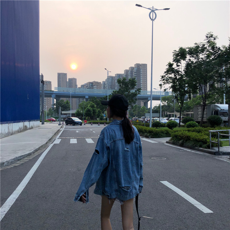 韓版時尚秋裝女2018新款上衣寬松顯瘦水洗復古割破破洞牛仔外套潮
