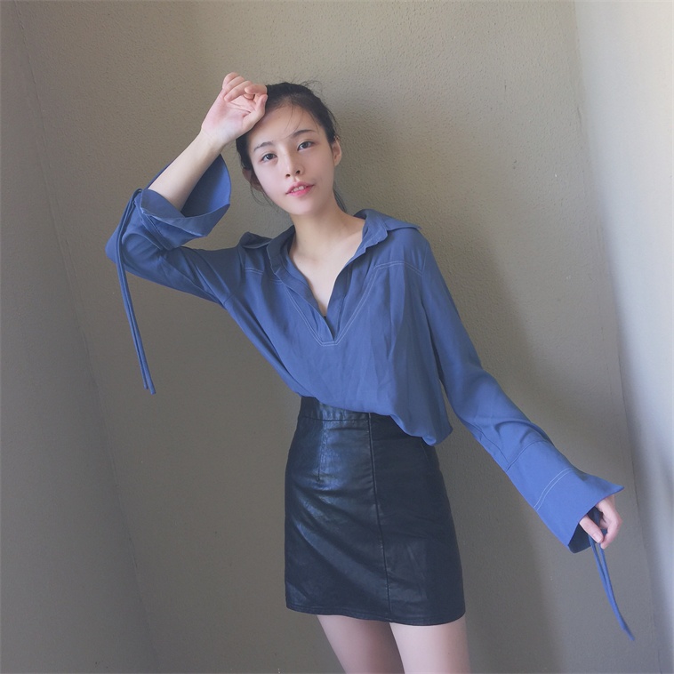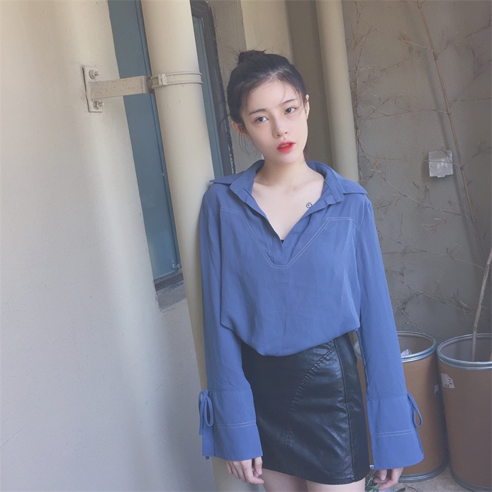 秋裝女2018新款chic早秋襯衫系帶喇叭袖韓范學生修身長袖襯衣女