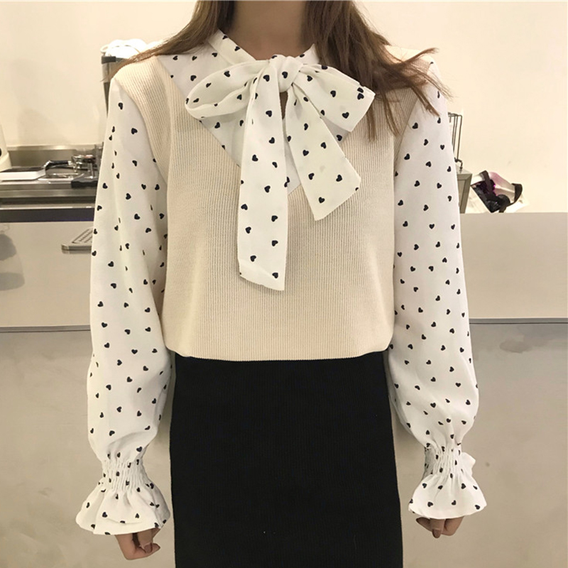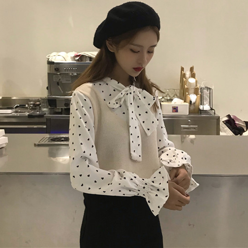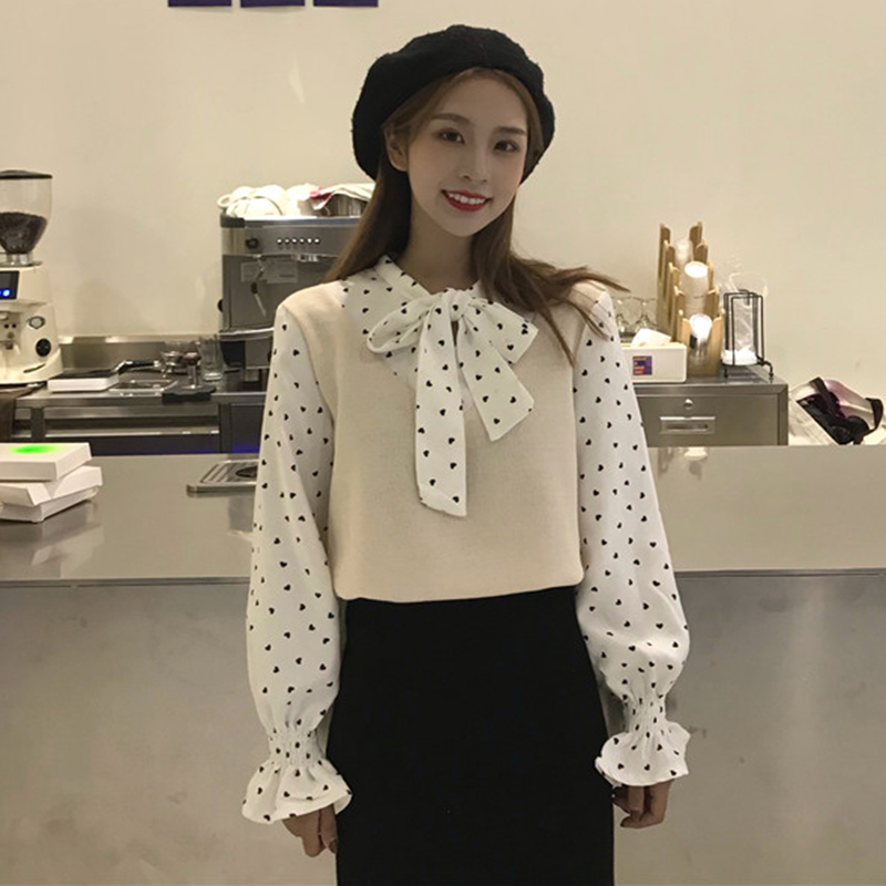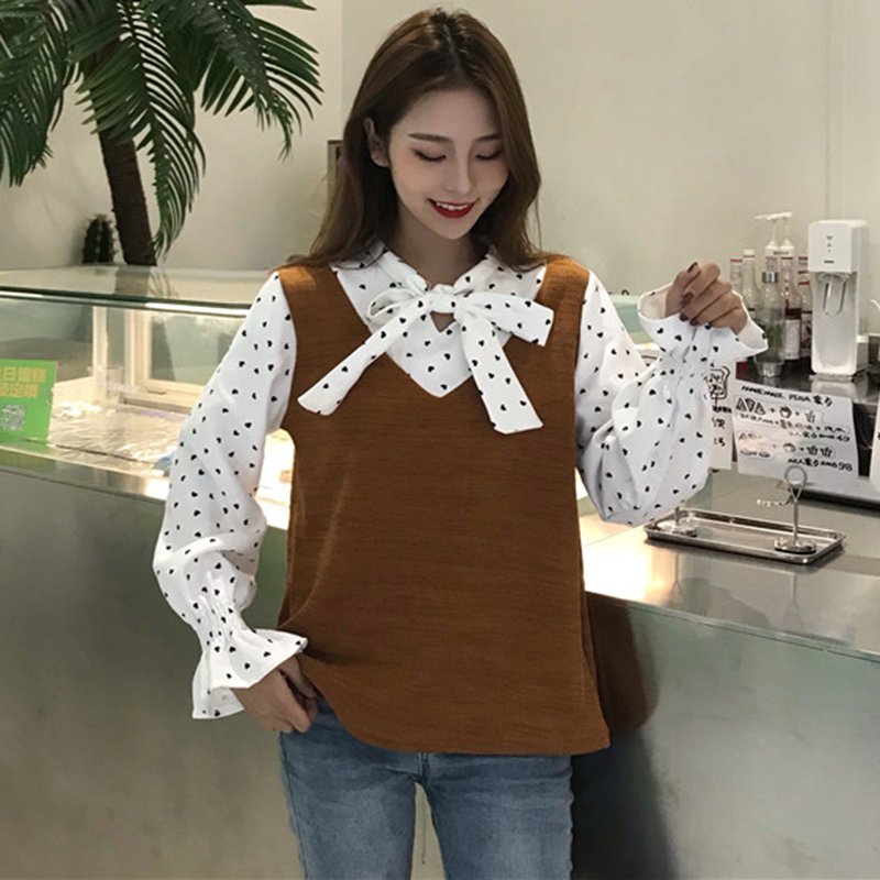 / 韓版拼接馬甲假兩件長袖襯衫女秋冬裝新款小清新學生寬松長袖上衣