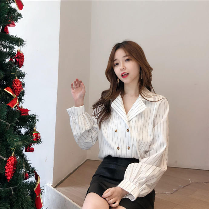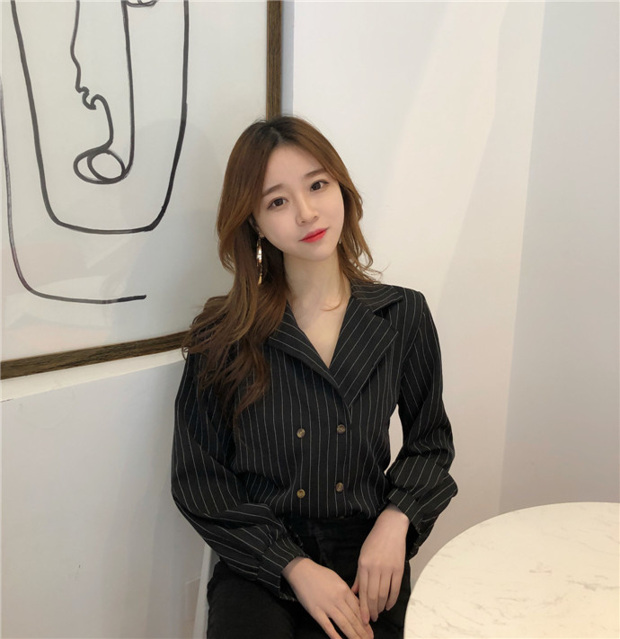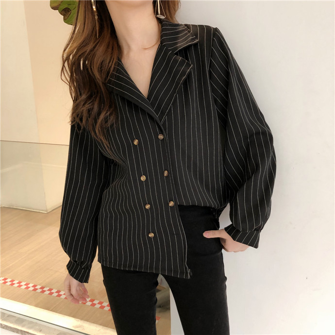 春裝韓版港味雙排扣西裝領復古條紋上衣女百搭寬松長袖襯衫上衣潮