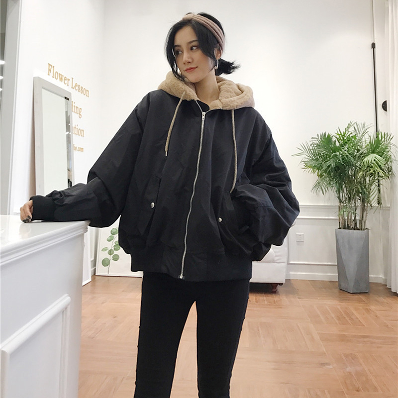 時尚加絨保暖黑色夾克棉服秋冬女裝新款學生寬松長袖棉衣連帽外套