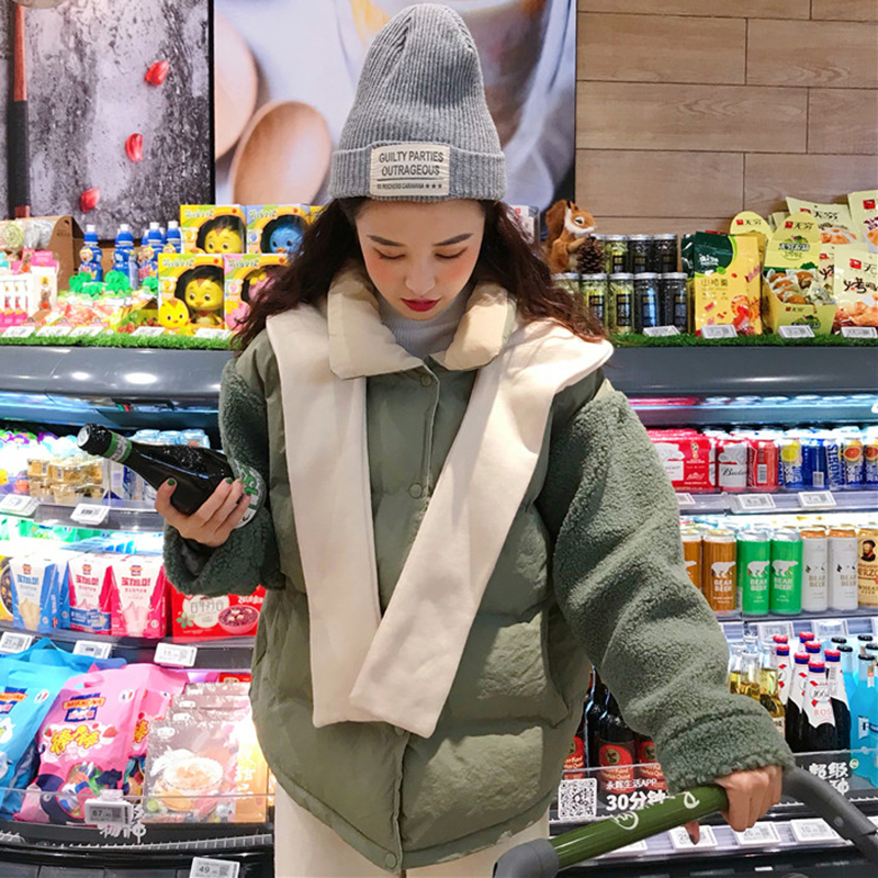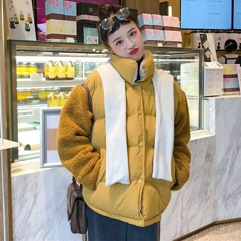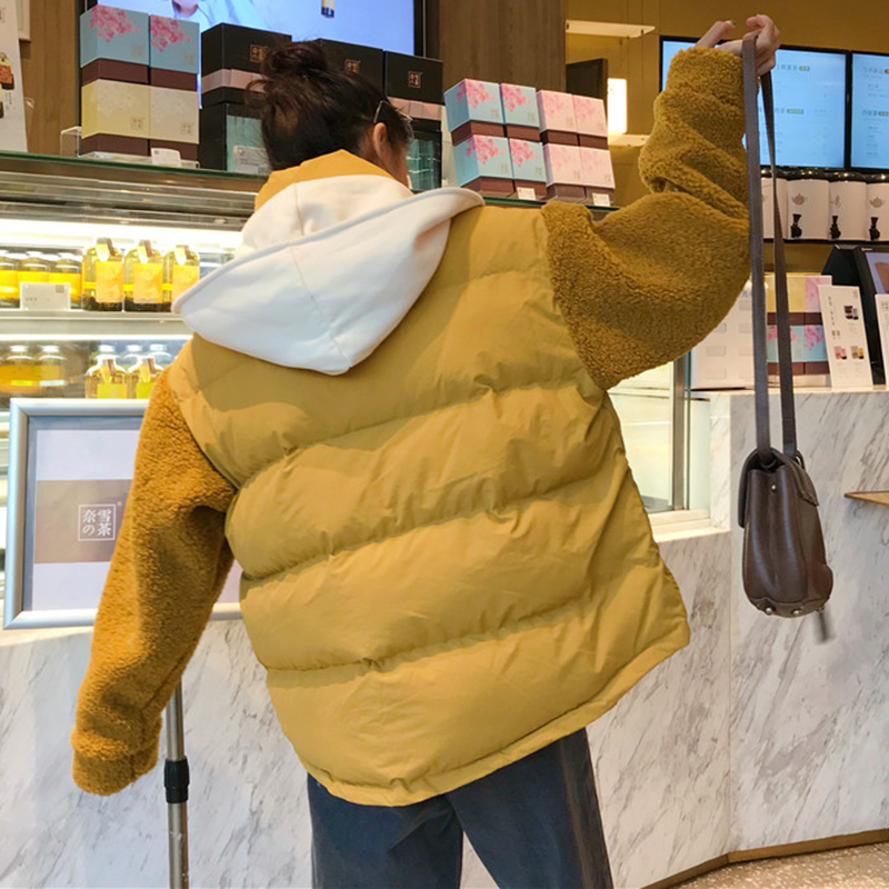 / 仿羊羔毛拼接面包服學生假兩件棉襖冬季女裝新款寬松加厚棉衣外套