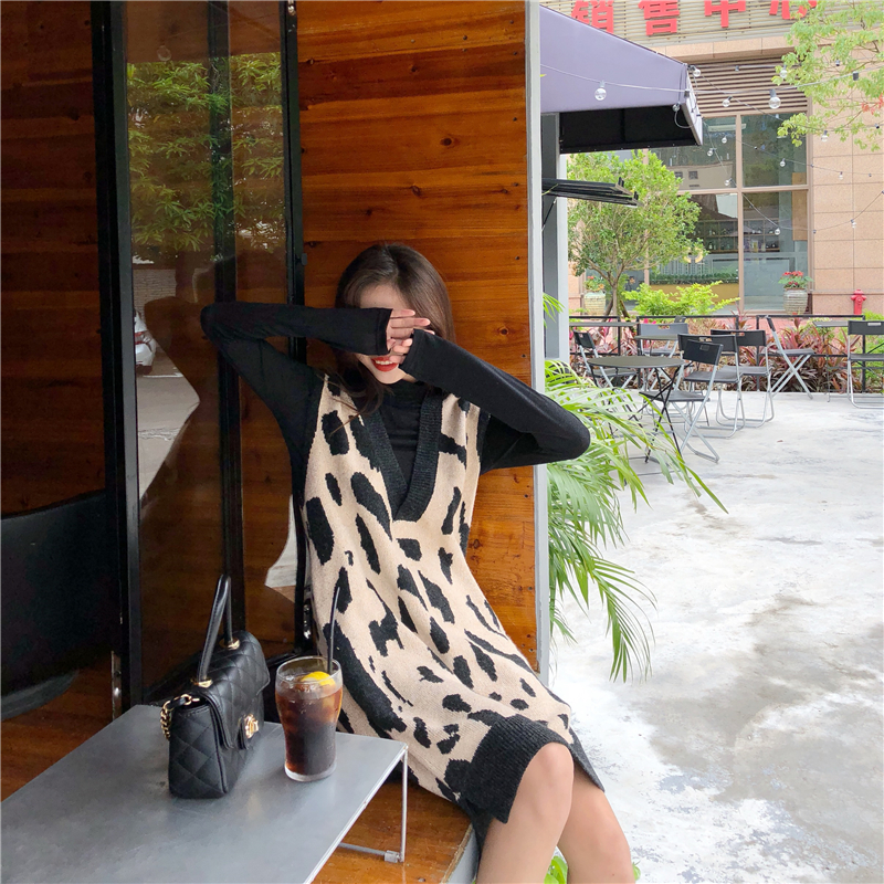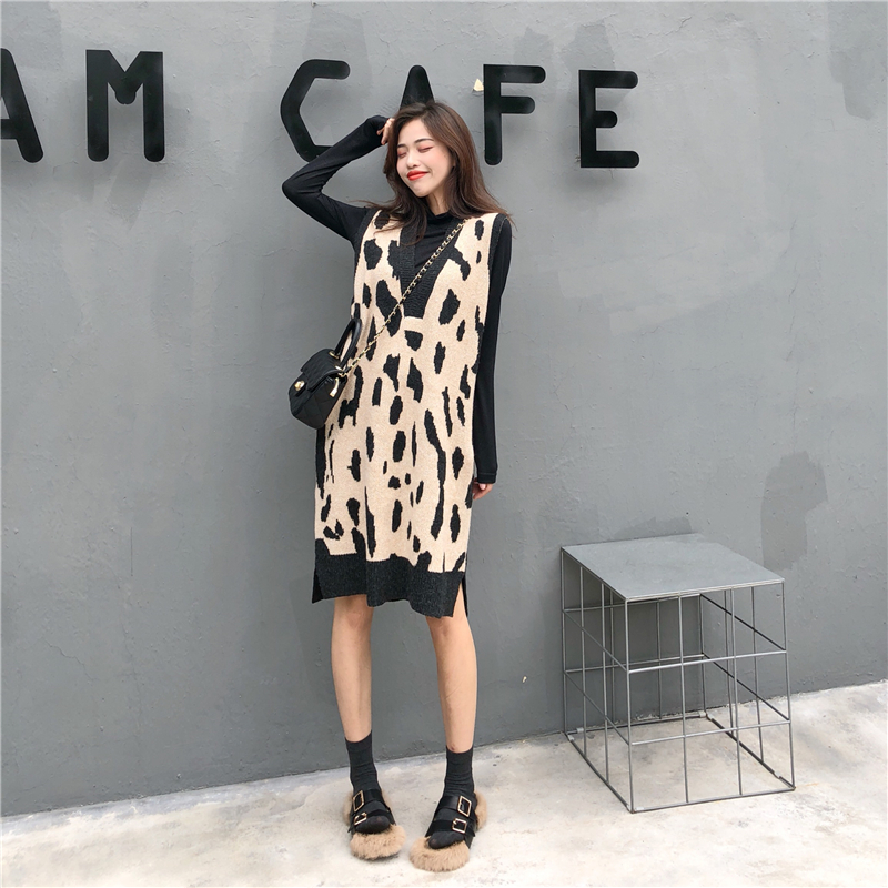 / 復古韓國chic風豹紋V領針織衫時尚慵懶寬松中長款無袖毛衣馬甲女