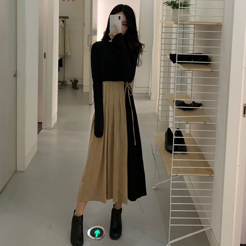 / 套裝女秋冬2018新款拼接V領中長吊帶連衣裙子修身長袖黑色T恤上衣