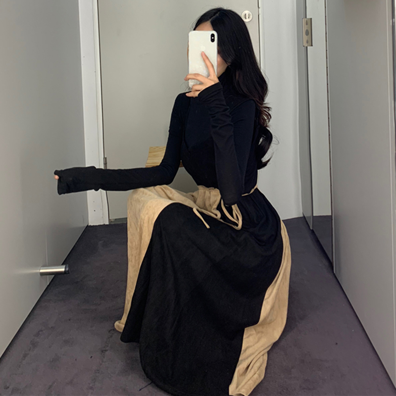 套裝女秋冬2018新款拼接V領中長吊帶連衣裙子修身長袖黑色T恤上衣