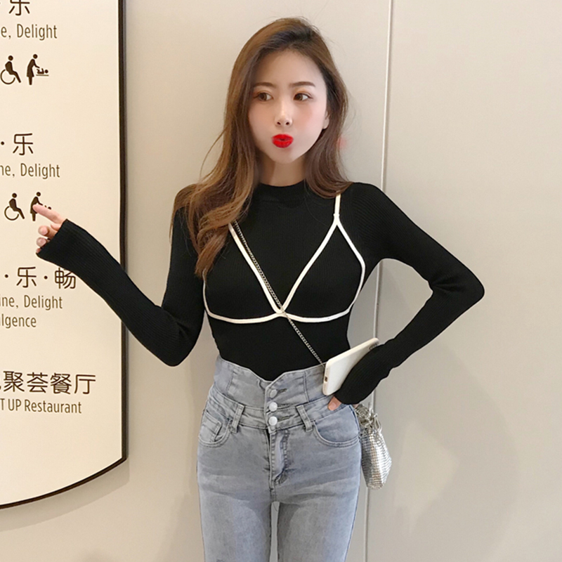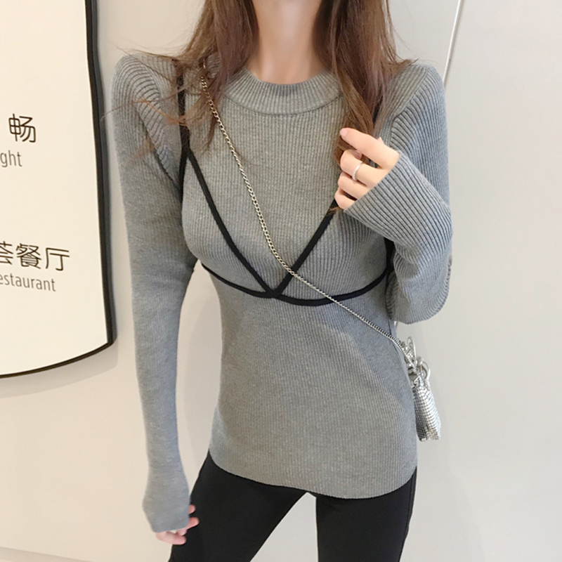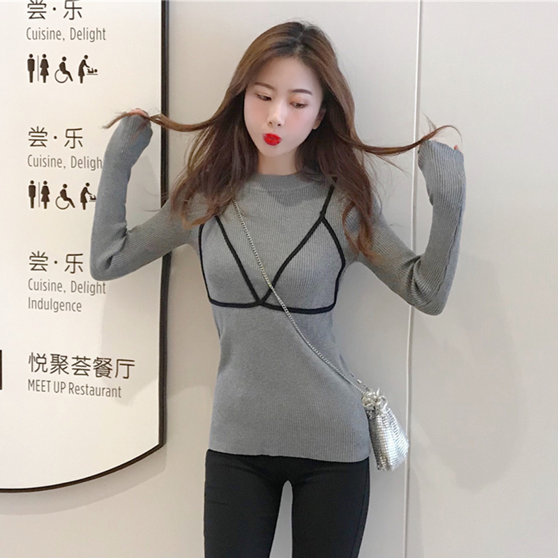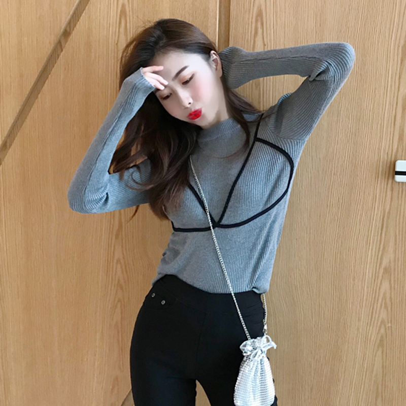 秋冬裝2018新款時尚撞色T恤修身顯瘦打底針織衫女長袖短款上衣潮