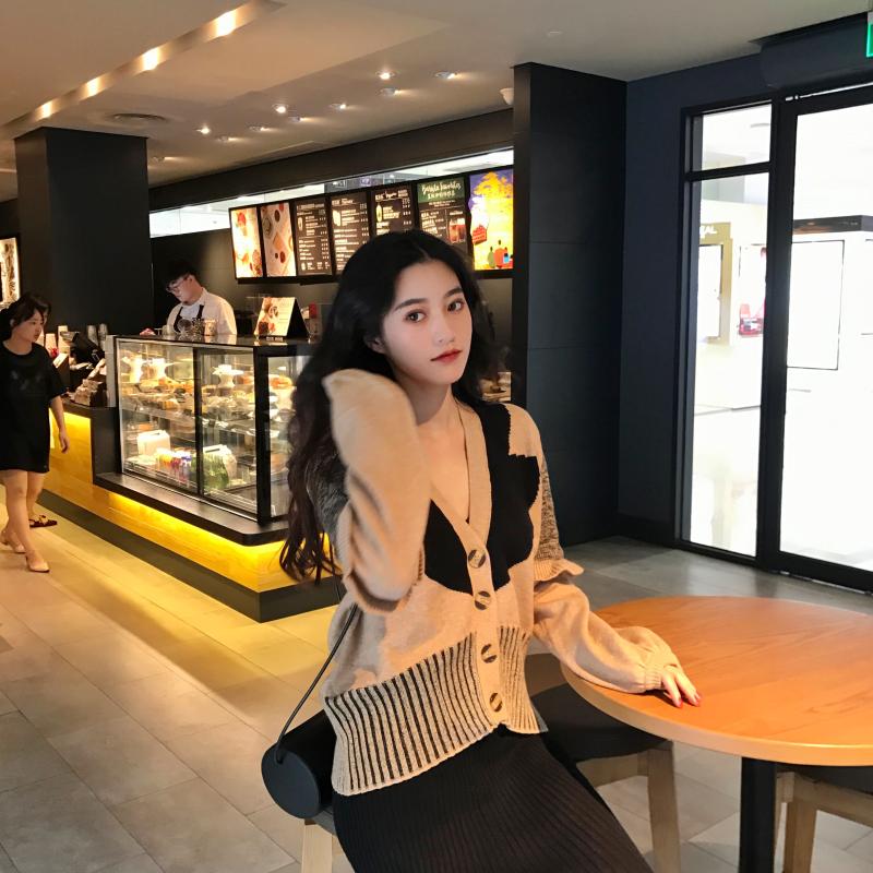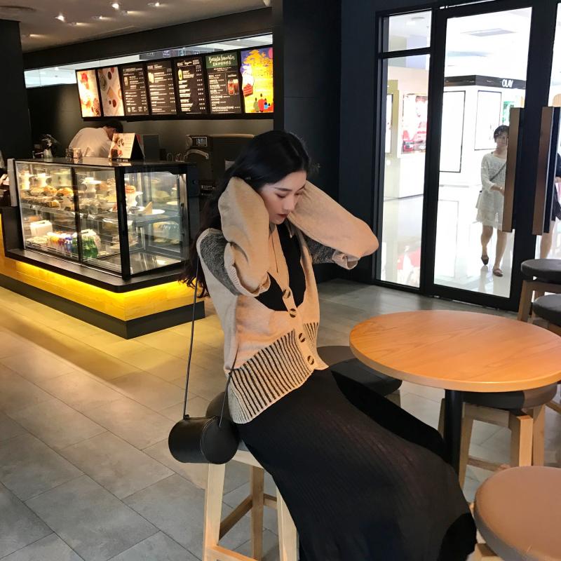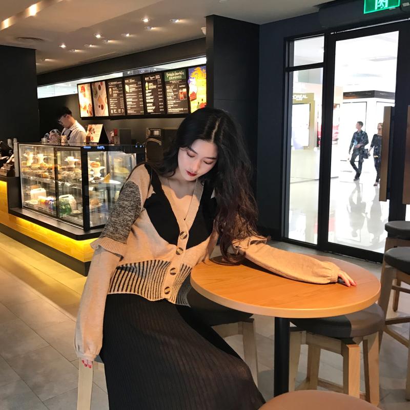 / 秋裝女2018新款套裝時尚兩件套幾何拼接撞色開衫+黑色針織半身裙