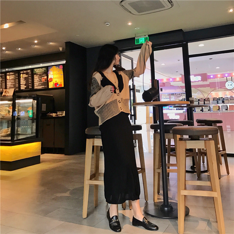 秋裝女2018新款套裝時尚兩件套幾何拼接撞色開衫+黑色針織半身裙