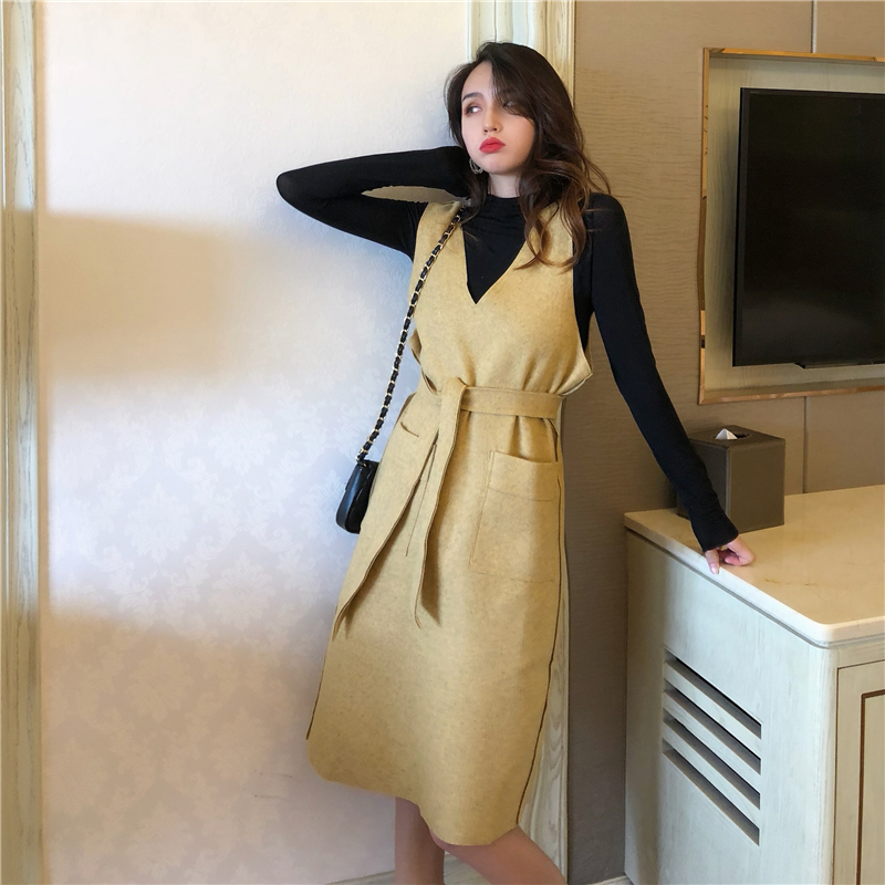 / 港味秋季套裝女時尚兩件套純色毛呢背心連衣裙+簡單純色打底長袖