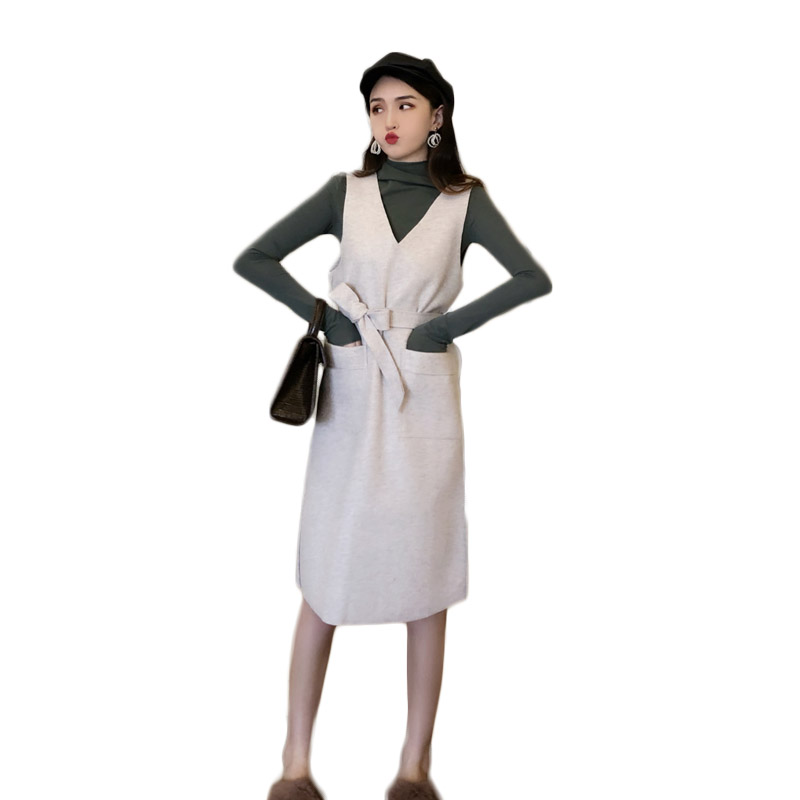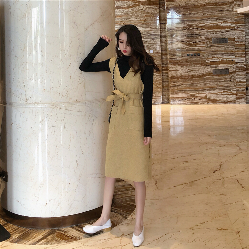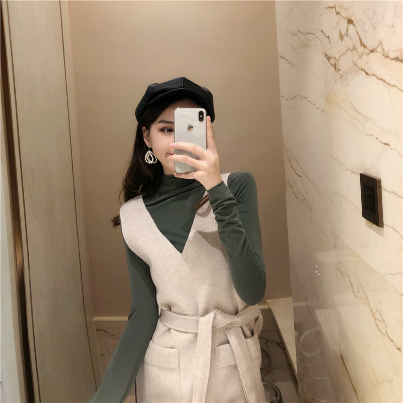 秋裝女2018新款chic高領純色打底衫+燈芯絨吊帶長裙優雅顯瘦套裝