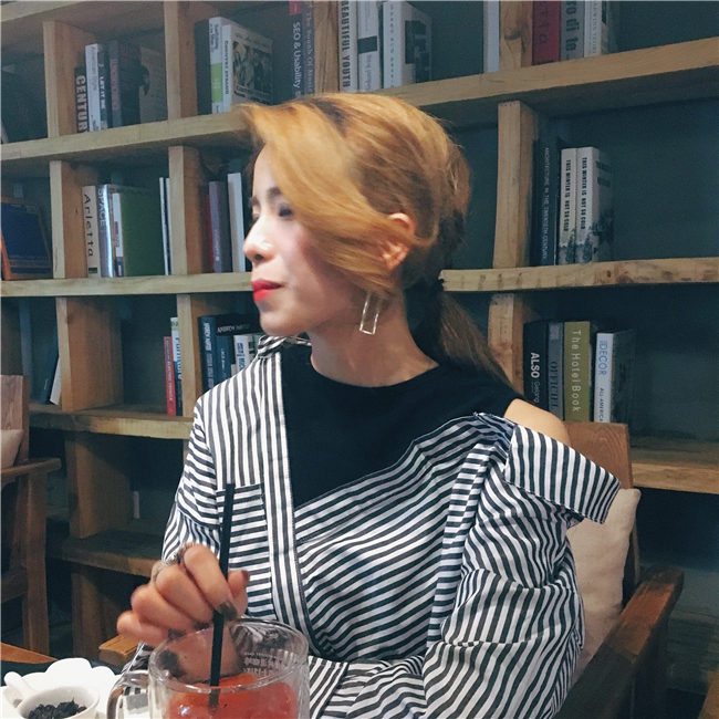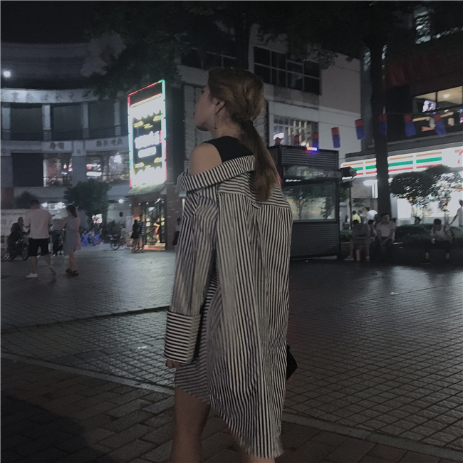 / 早秋時尚潮品女士百搭條紋襯衫韓版寬松露肩不規則拼接學生假兩件