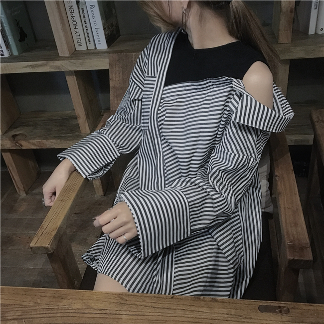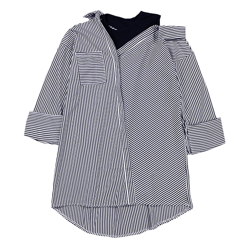 早秋時尚潮品女士百搭條紋襯衫韓版寬松露肩不規則拼接學生假兩件