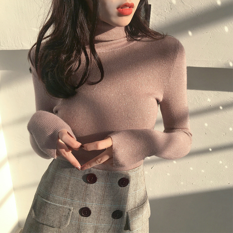 chic早秋毛衣慵懶風修身顯瘦高領亮絲針織衫女長袖毛衣打底上衣潮