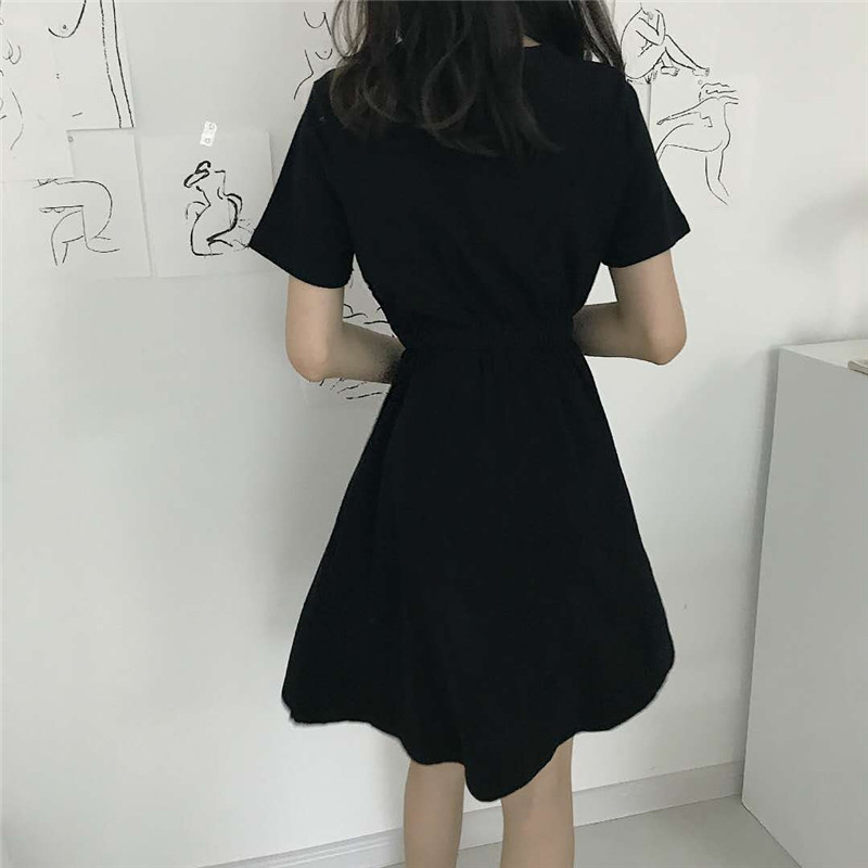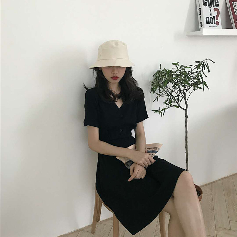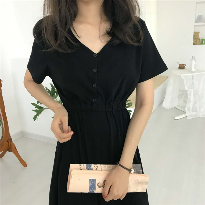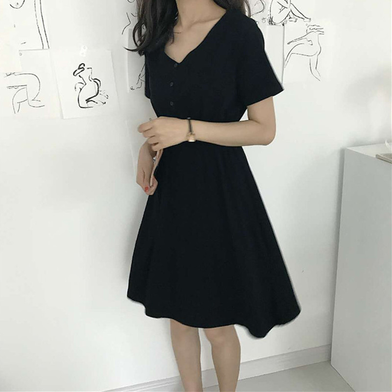 / 新款夏季韓版女裝復古風修身顯瘦小黑裙休閑百搭短袖V領連衣裙女