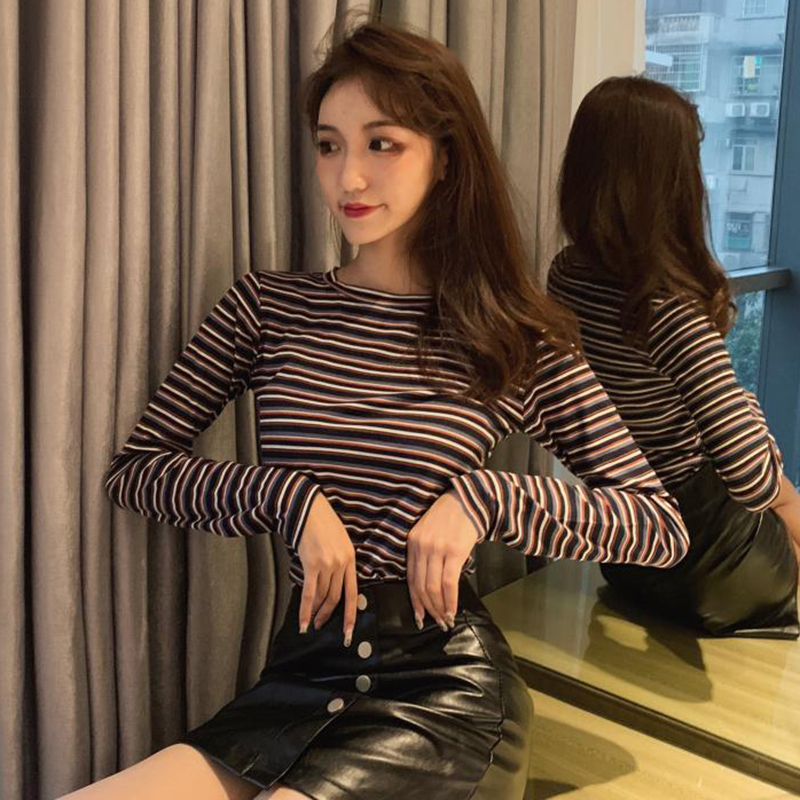 秋裝女2018新款韓版條紋長袖T恤學生修身打底衫百搭圓領體恤上衣