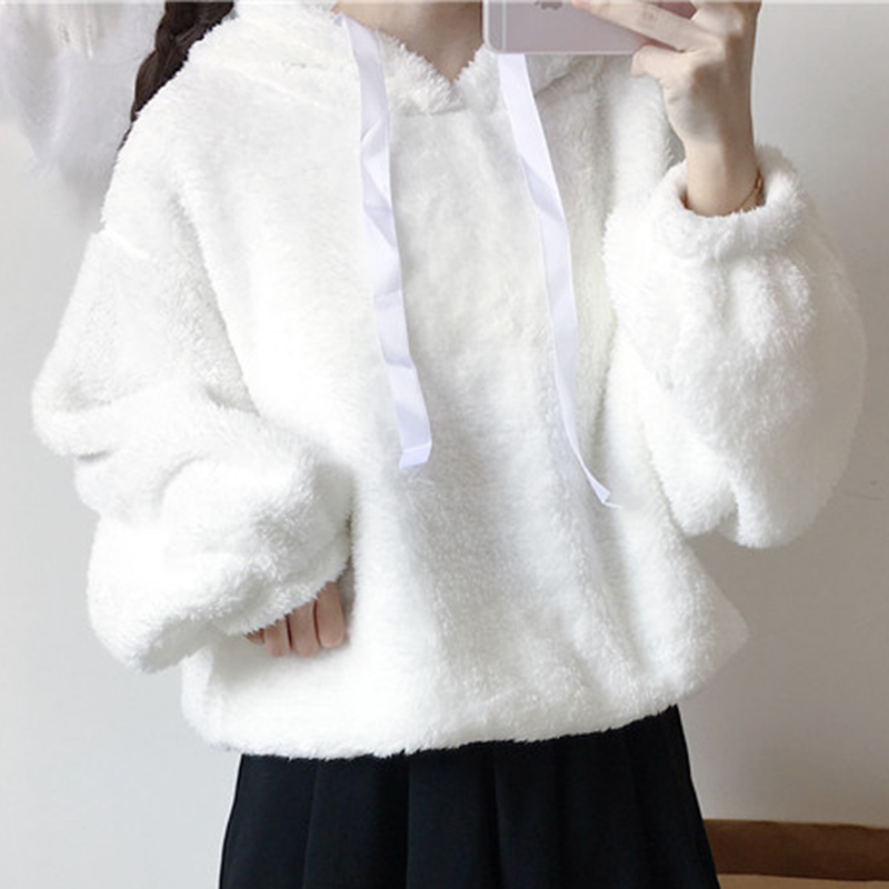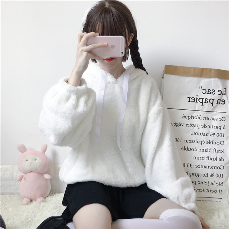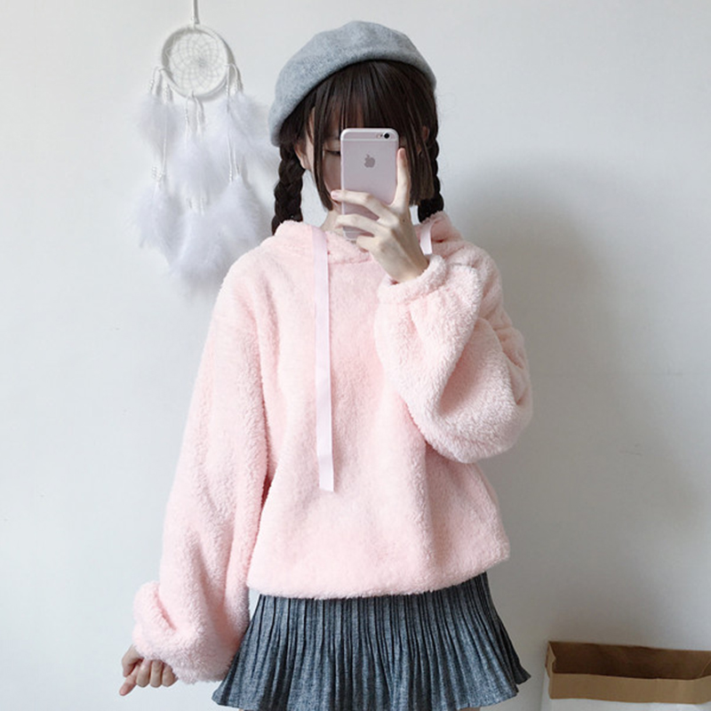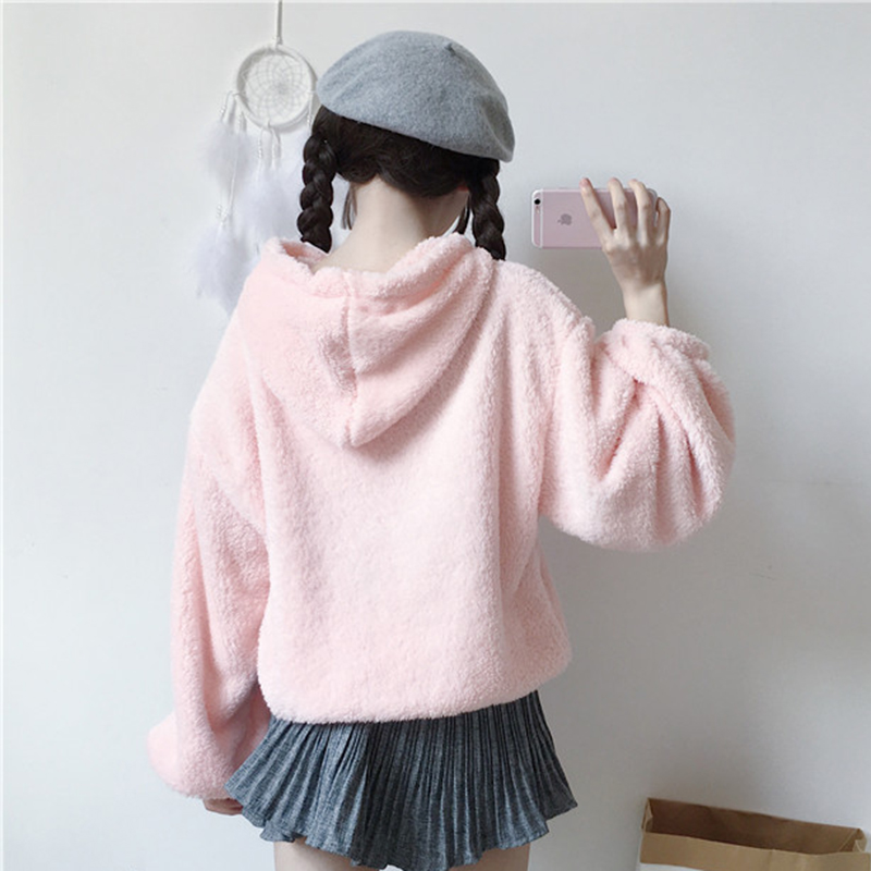 日系少女毛絨連帽衛衣外套秋裝女2018新款甜美清新學生燈籠袖上衣