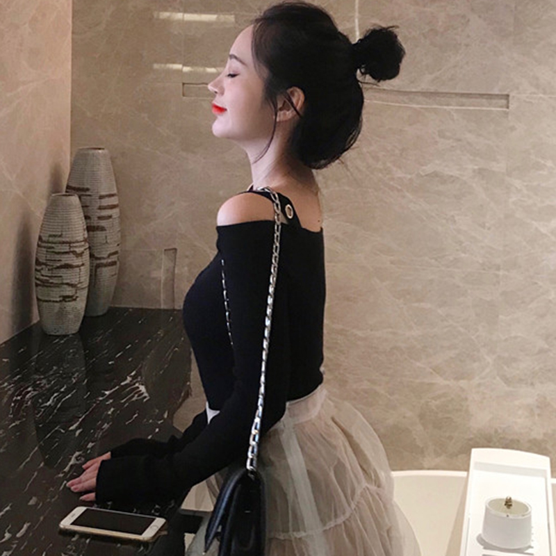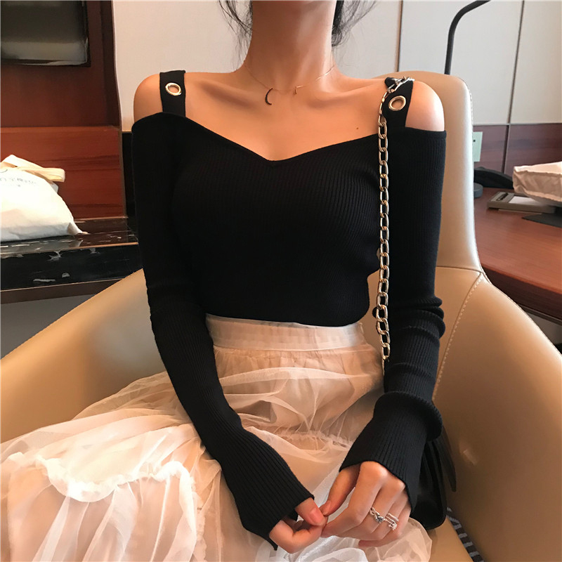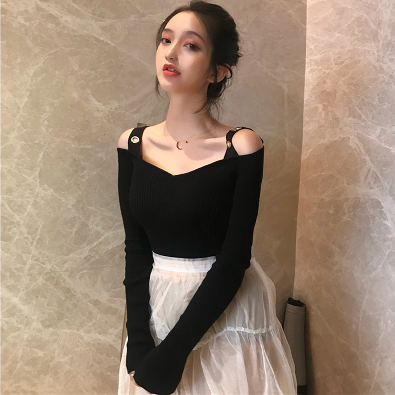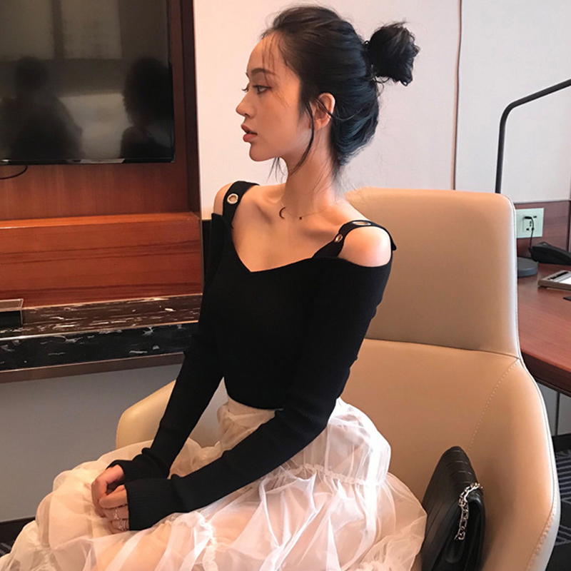 氣質露肩V領針織衫女秋冬裝新款黑色長袖短款打底上衣學生修身T恤