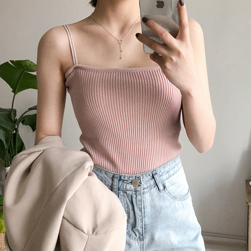 時尚糖果色雙吊帶針織背心秋裝女2018新款簡約修身打底衫短款上衣