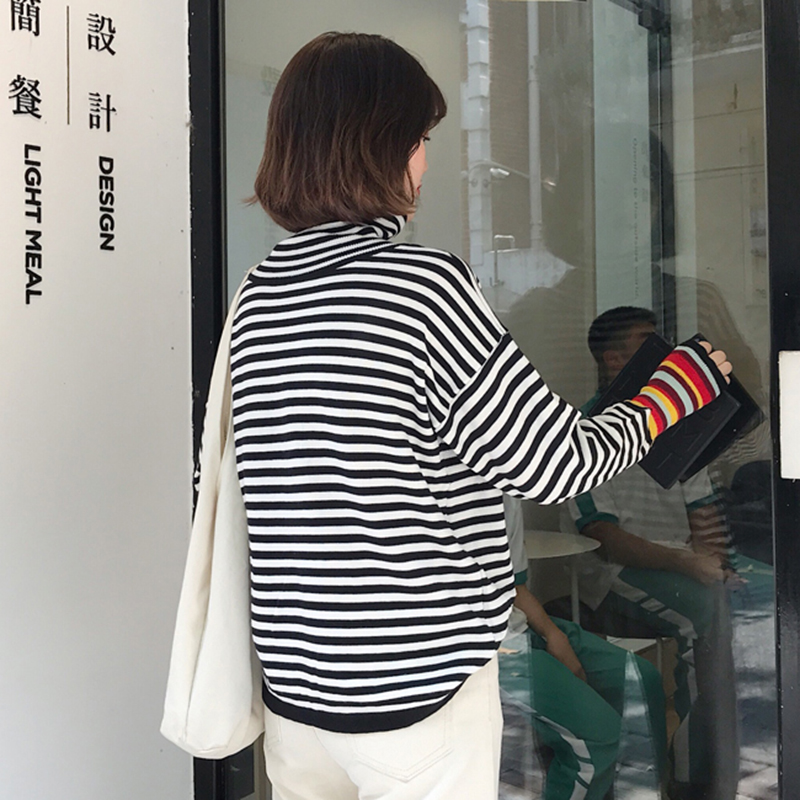/ 毛衣女2018新款秋裝時尚拼色長袖條紋針織衫學生修身高領打底上衣