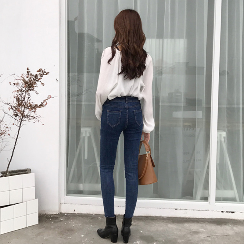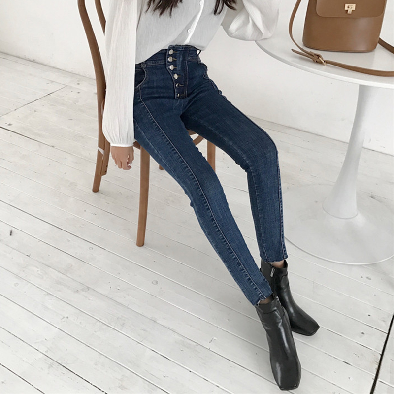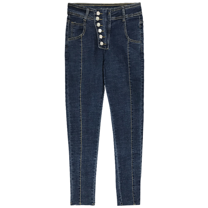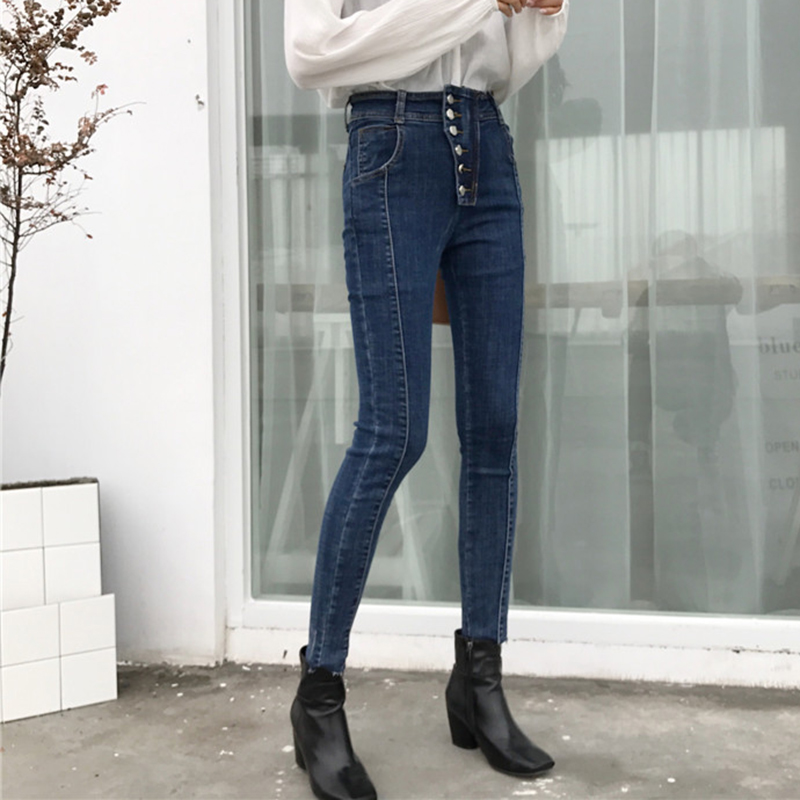 修身牛仔長褲秋裝女2018新款復古高腰排扣九分小腳褲緊身鉛筆褲子
