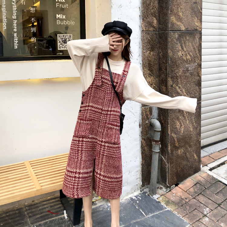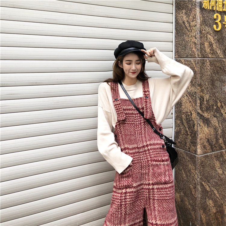 港味秋裝女2018新款套裝寬松百搭毛衣+法式紅格紋毛呢背帶連衣裙