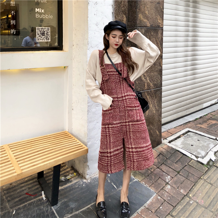 秋裝女新款溫柔風百搭款打底衫+紅色格子收腰背帶裙中長款連衣裙