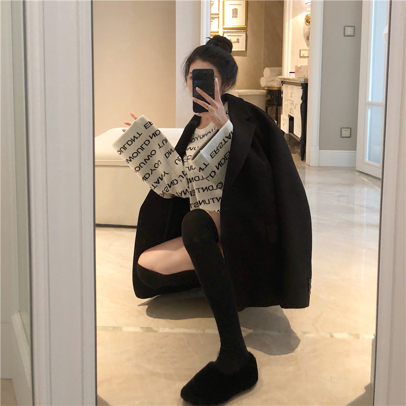 韓版秋裝女2018新款套裝字母套頭毛衣+黑色帥氣西裝外套兩件套潮