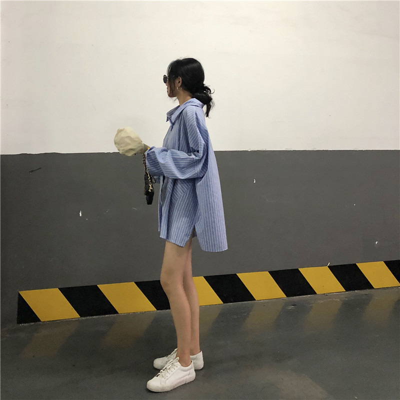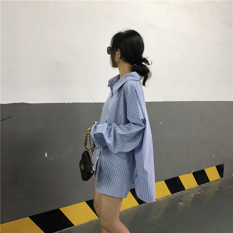 韓版時尚秋裝女2018新款港味條紋披肩拼接長袖寬松純色百搭襯衣潮